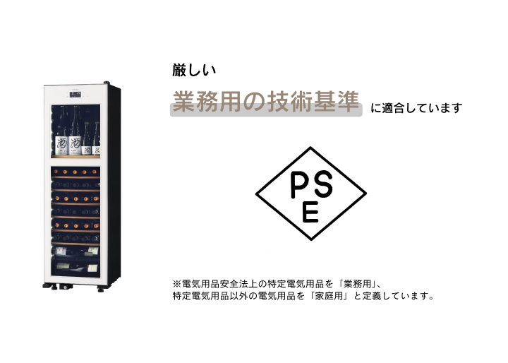飲食店での利用を想定したワインセラーには、家庭用よりも厳しい業務用の技術基準が存在します。当社が2020年以降に販売している製品は、この厳しい検査をクリアしているため、ご安心ください。業務用基準の耐久性・安全性を持っていながら、家庭用レベルで省エネ性能やコストパフォーマンスに優れていることが、多くの飲食店で採用されている理由です。