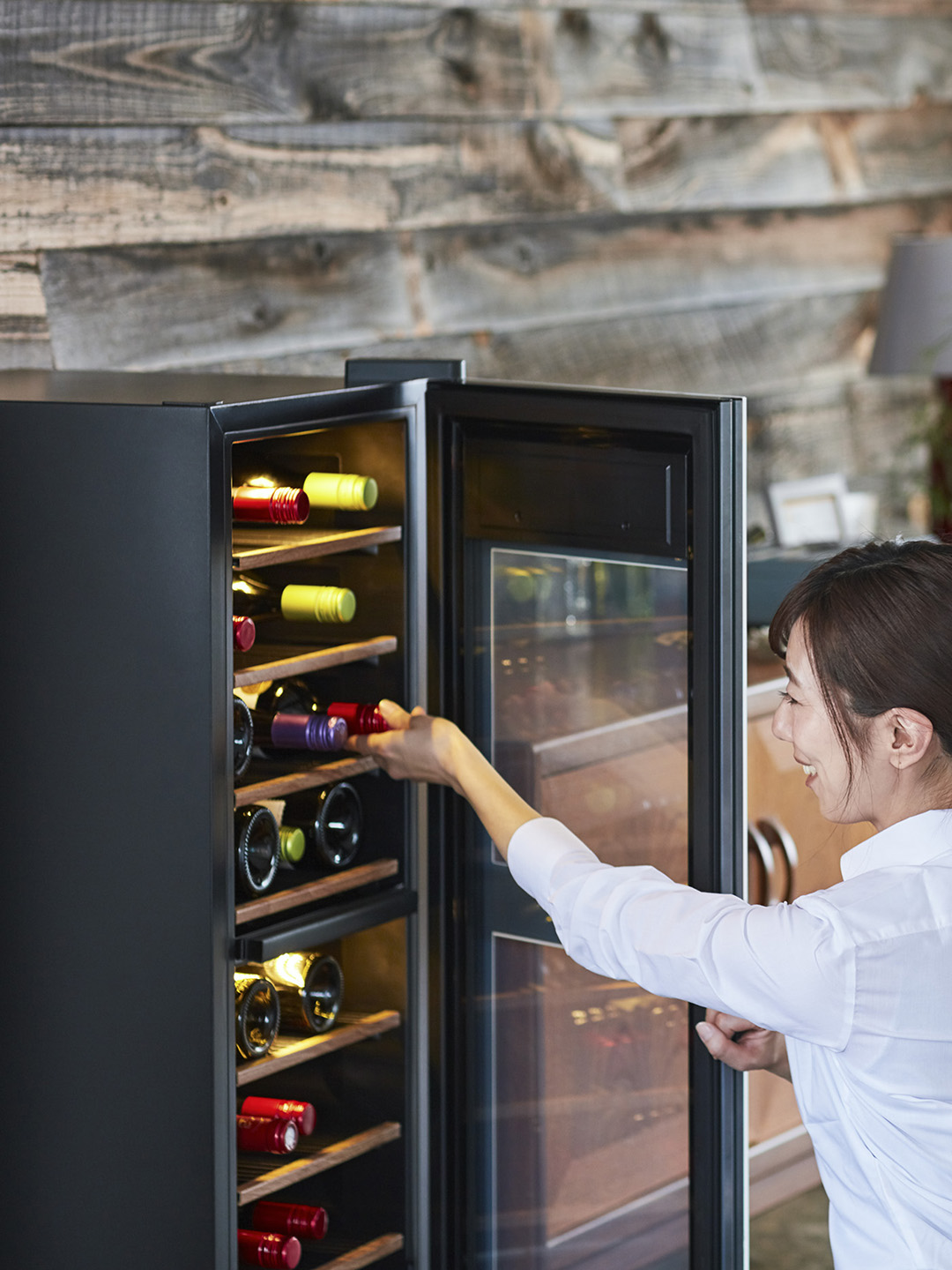 赤ワインと白ワイン、ミディアムボディとフルボディなどのワインの性質によってお客さまへご提供する温度を変えたいというニーズに合わせ、お好みの設定温度を1℃毎に替えられる2温度管理式のワインセラーを開発しています。0℃に管理する機種をお選びいただければワインと日本酒の同時保管も可能です。