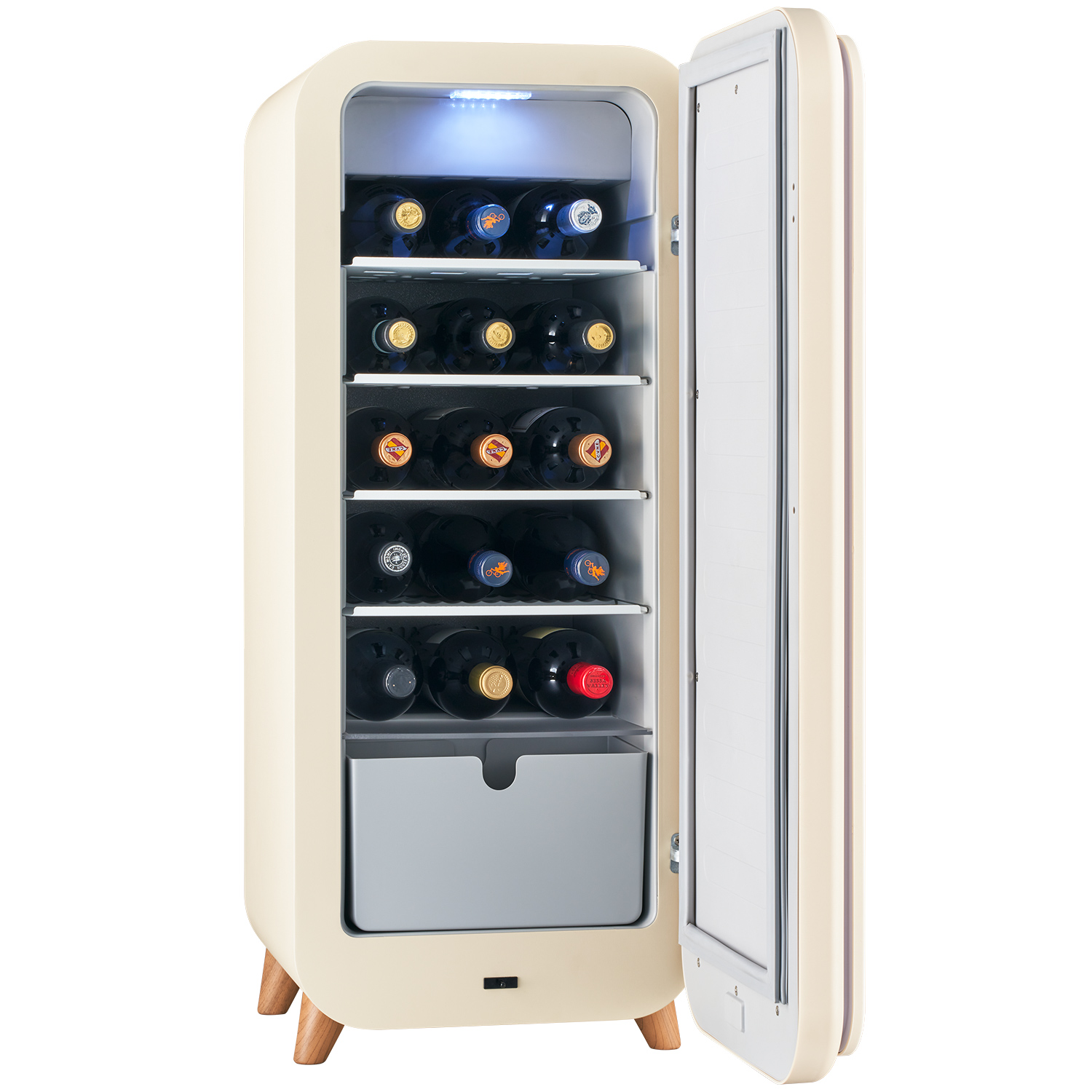 FROSTYは、大型冷蔵庫と同等の優れた冷却機能を持ち、ワインボトルまで保管できる高い収納性が特徴です。さまざまなドリンクをより美味しくお楽しみいただけます。