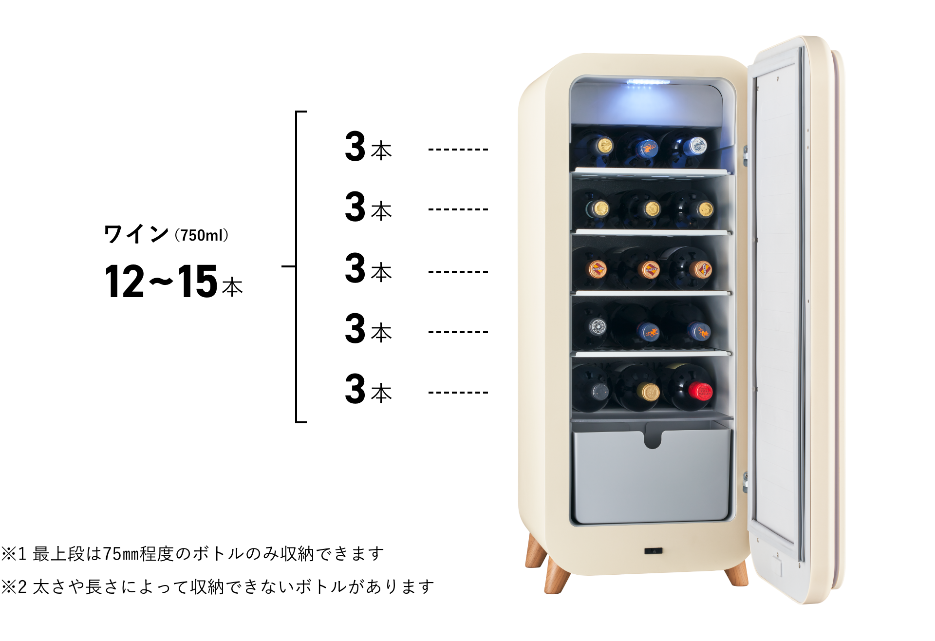 | 収納本数(ワイン) | 12本~15本程度(最上段はボルドーのみ) | |