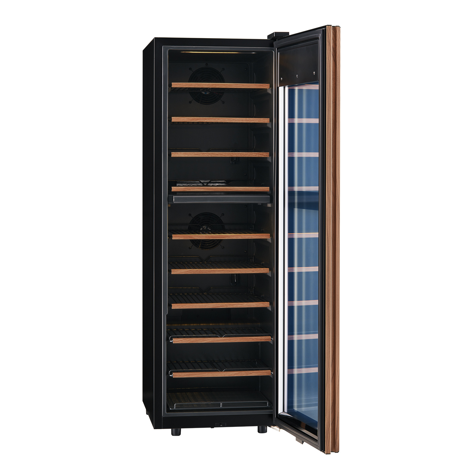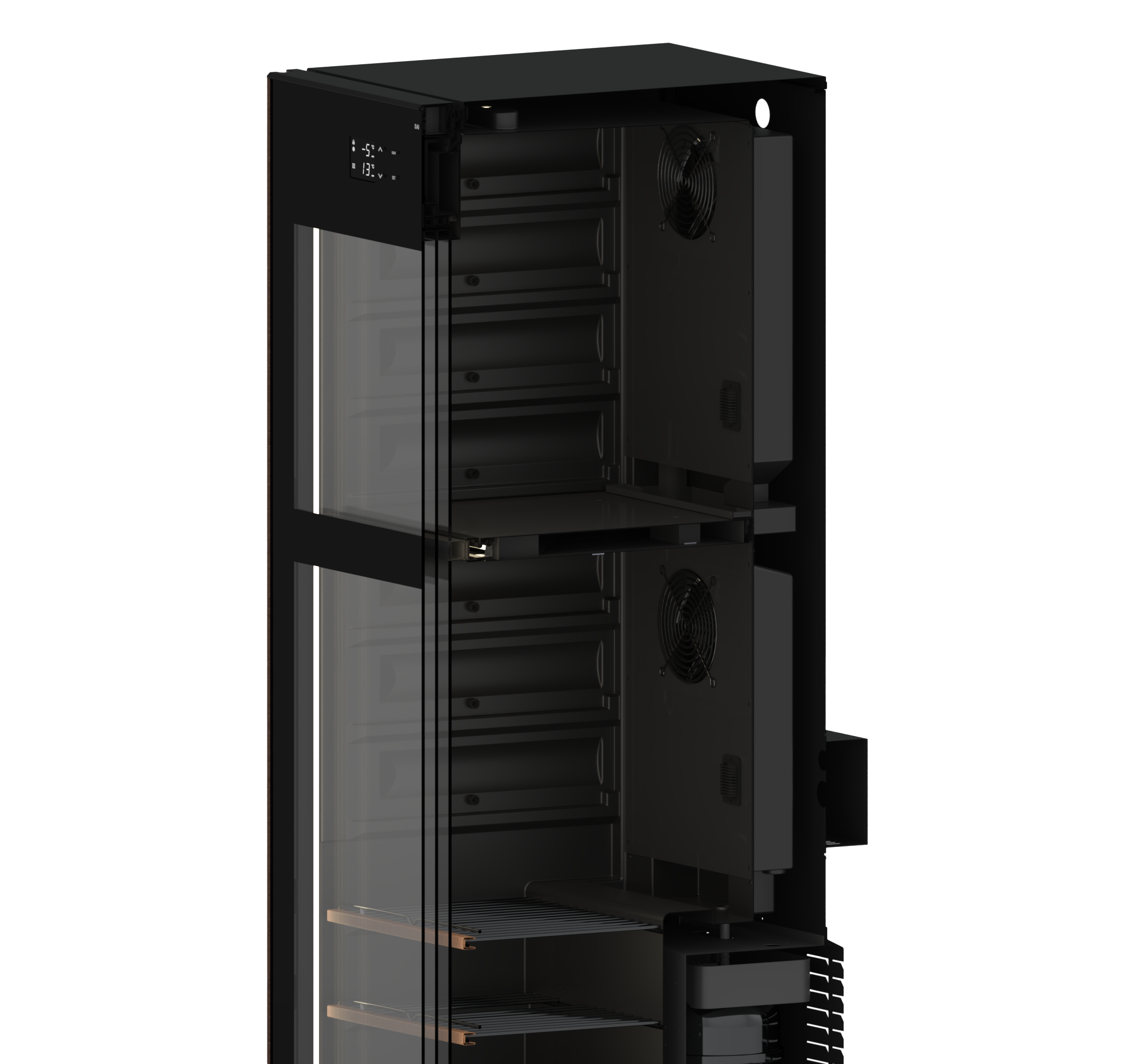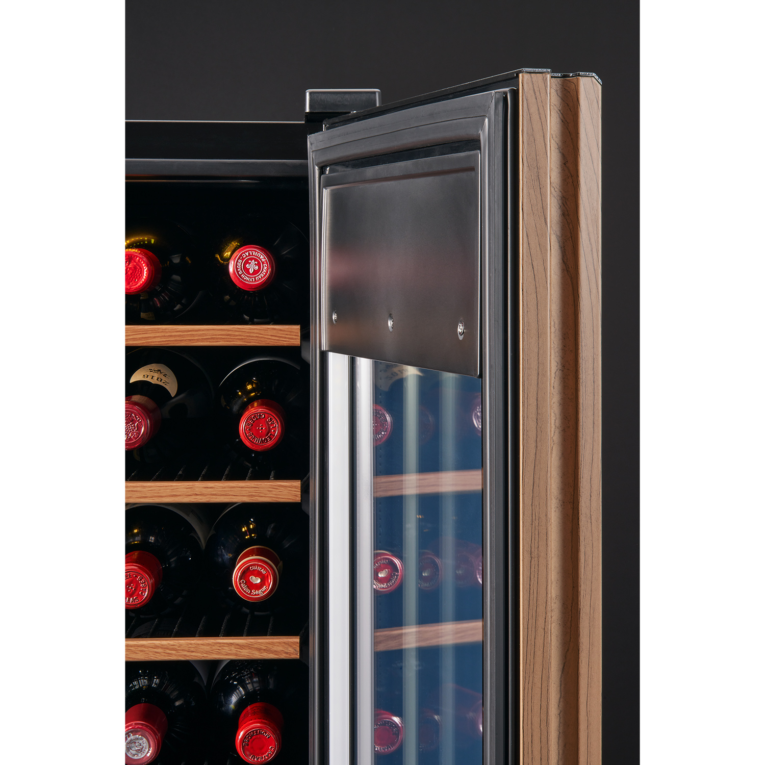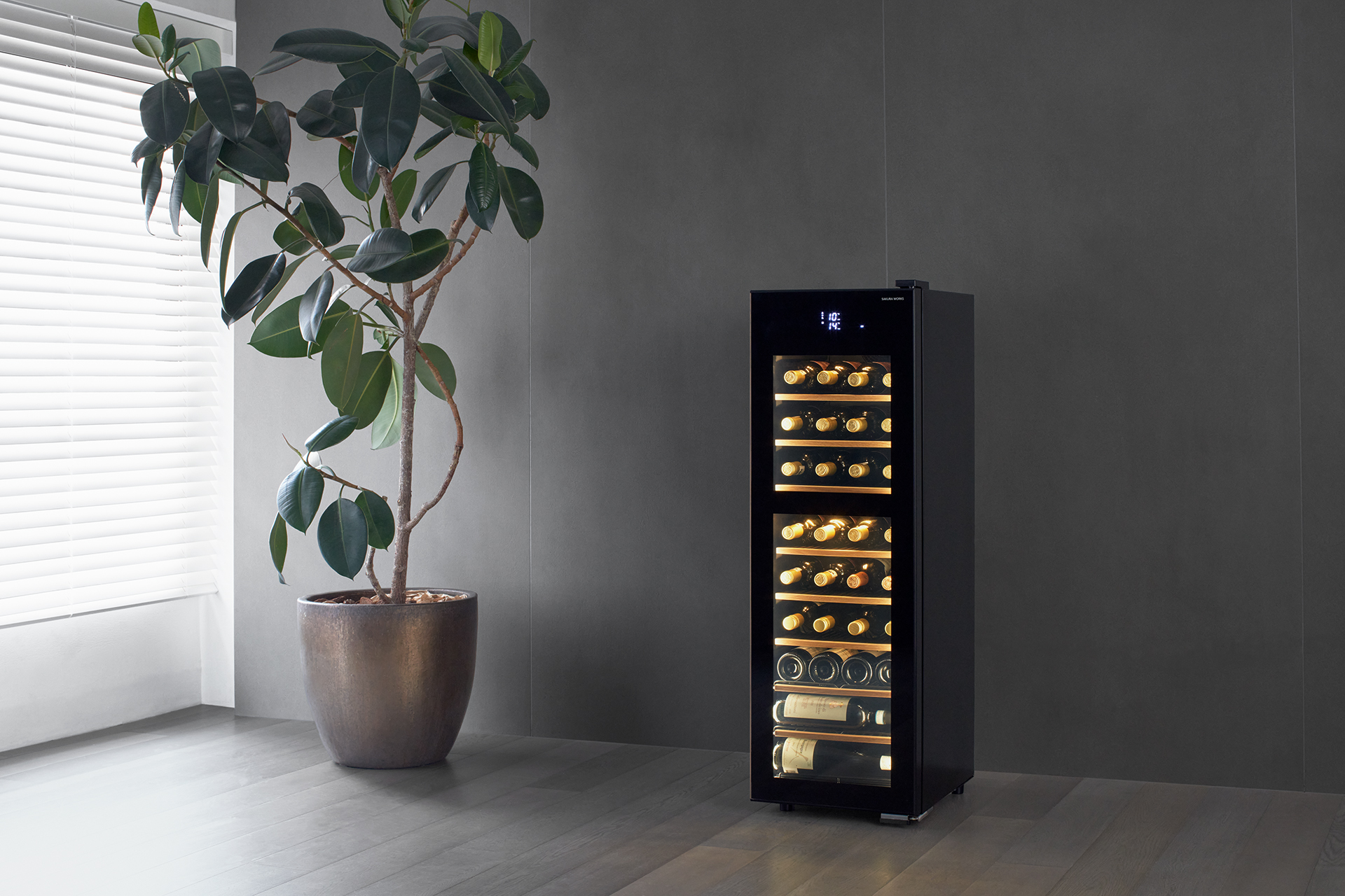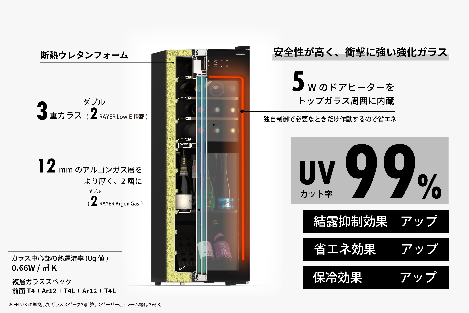 ガラスドアは、ワインや日本酒の保管に欠かせないアイテムです。3枚ガラス構成(T4 + Ar12 + T4L + Ar12 + T4L)を採用し、Ug値約0.66W/(m²·K)という住宅用高断熱窓にも匹敵する性能を実現しました。2層のアルゴンガスと2面のLow-Eコーティングガラスが、外気温の影響を徹底的に遮断。庫内温度の安定性を高め、繊細な熟成や保冷環境を保ち続けます。さらにドアヒーターを搭載してガラス表面の結露の発生を抑え、クリアな視界と美しいディスプレイ性も両立。冷却負荷を軽減することで省エネ効果も期待できます。見せる楽しみと守る安心、その両方を一枚のドアに凝縮しました。