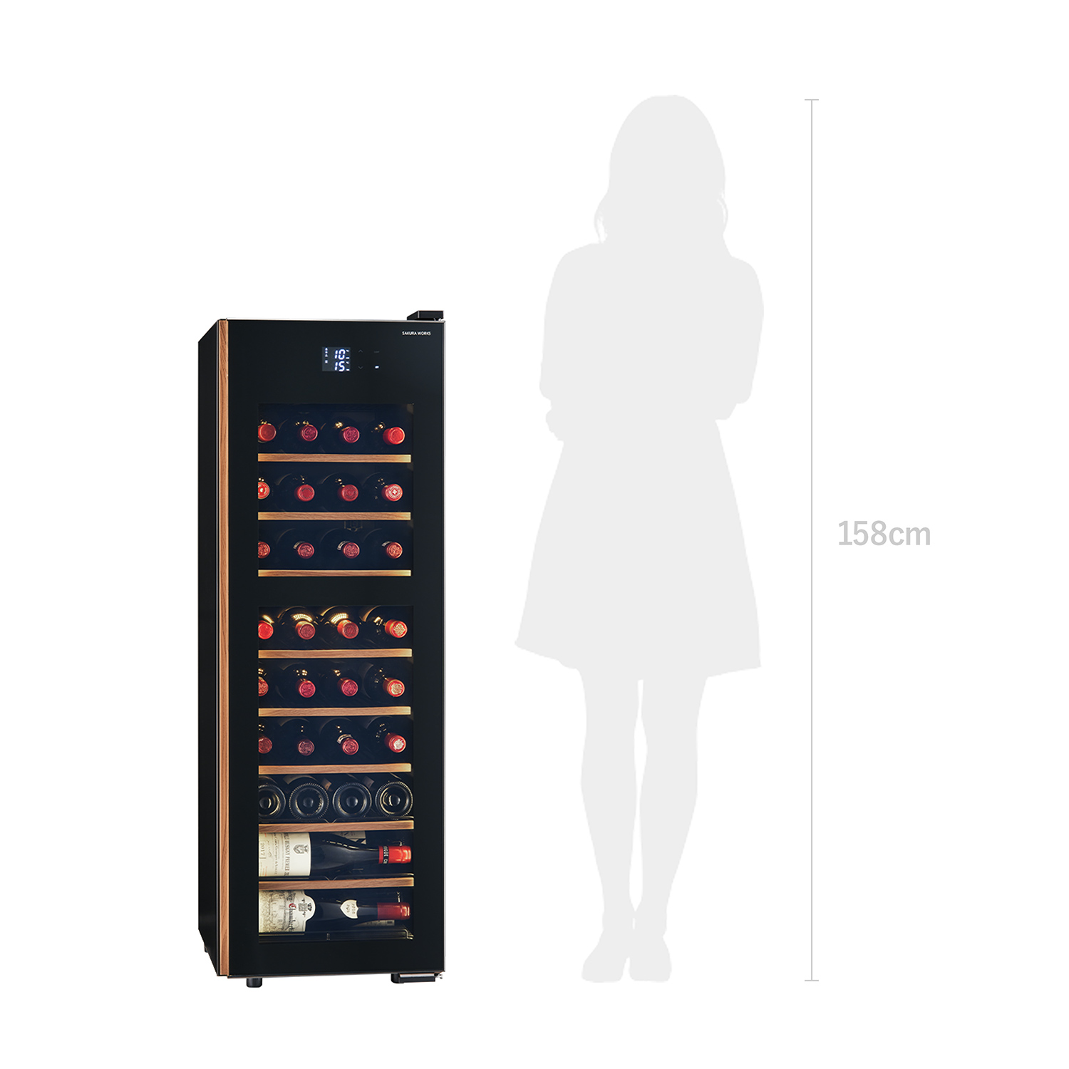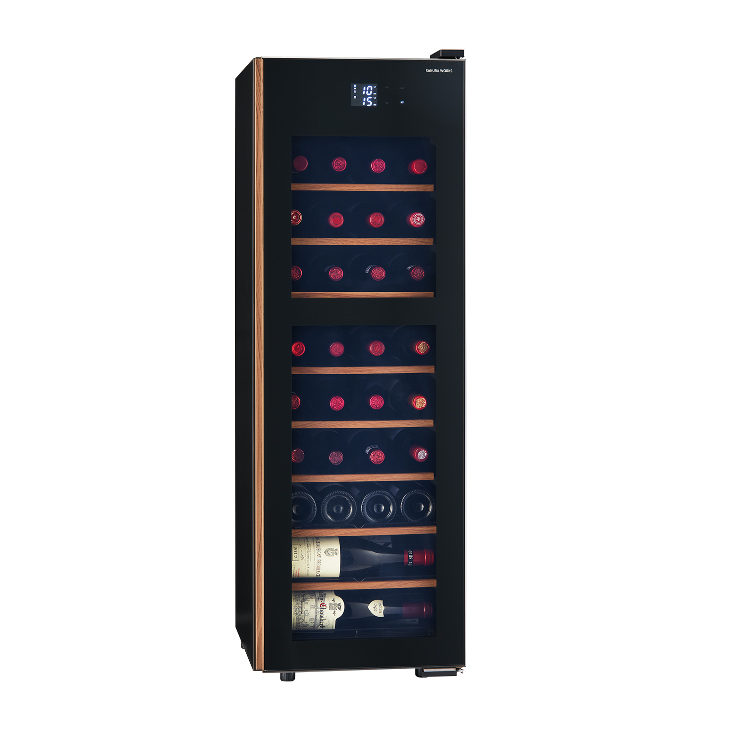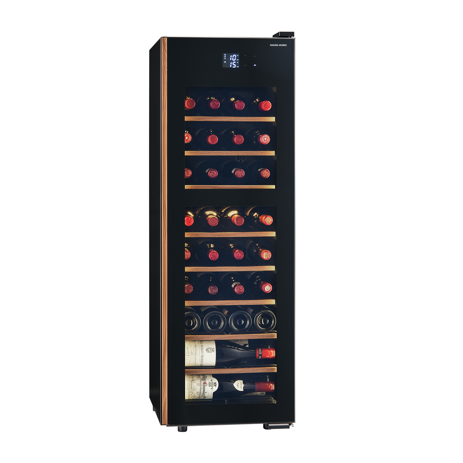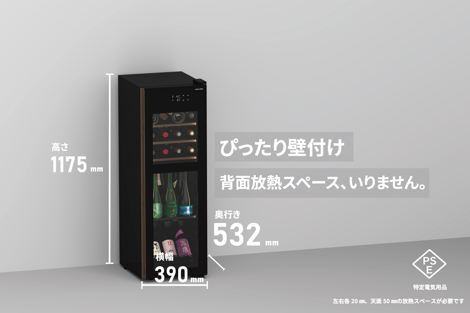 38本収納のスリムタワー型ワインセラー。 奥行532mmのコンパクト設計で住空間に美しく調和し、省スペースながら豊かな収納力を実現。背面を壁にぴったり付けられる独自の放熱構造と、基板を熱から守る安心設計で、安心と美しさを兼ね備えた一台です。さらに、家庭用サイズのセラーでは希少な「菱形PSE」の技術基準(※)に適合。信頼性も兼ね備えたモデルです。