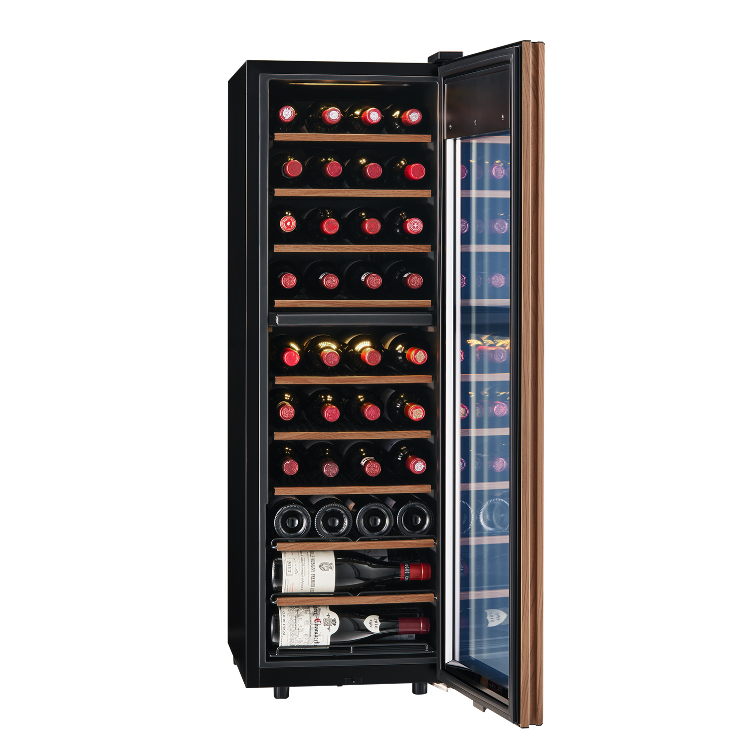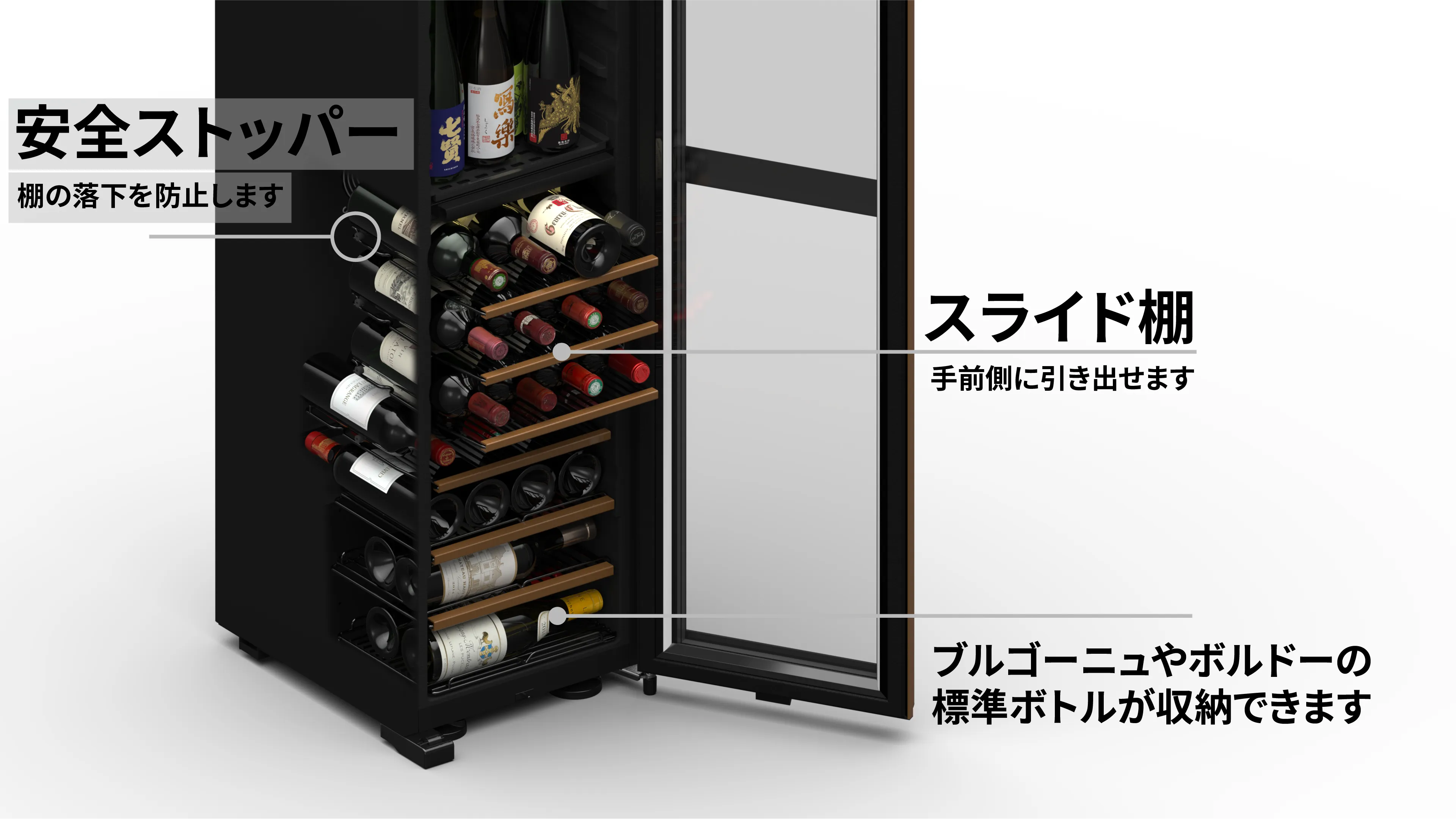 棚を手前に引き出せるスライド仕様で、ボトルの出し入れが簡単にできます。シャンパーニュなど太めのボトルも、ラベルを傷つけずに収納可能です。さらに、ドアを開けると庫内の照明が自動点灯する機能も搭載しています。