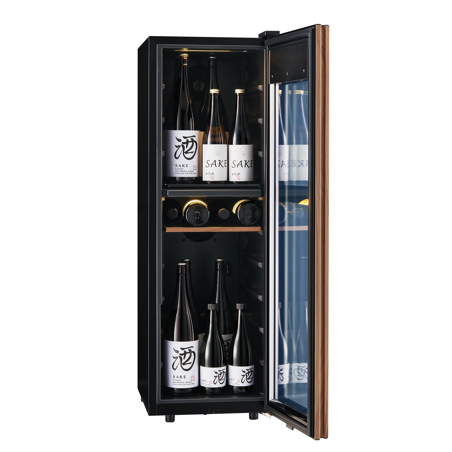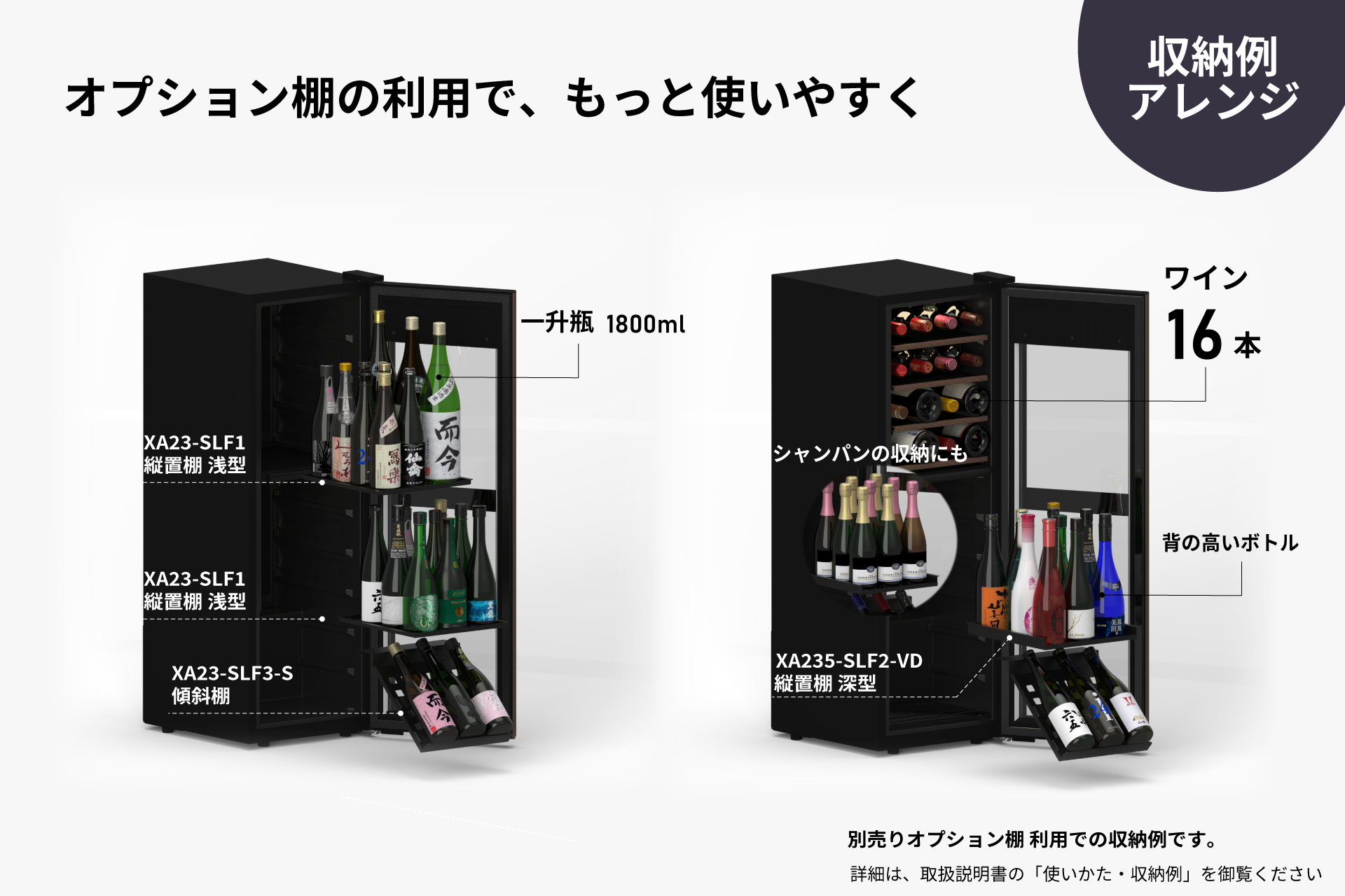オプション棚を使えば、日本酒を大切に保管する SAKE CELLAR® としても活躍します。720mlの4合瓶を23本から最大35本まで収納可能。日本酒のボトルは蔵ごとに形や大きさが異なりますが、標準的なボトルに適した縦置き棚に加え、純米大吟醸で採用されやすい背の高いボトルにも対応する縦置棚もご用意。用途にあったオプション棚の選択が可能です。