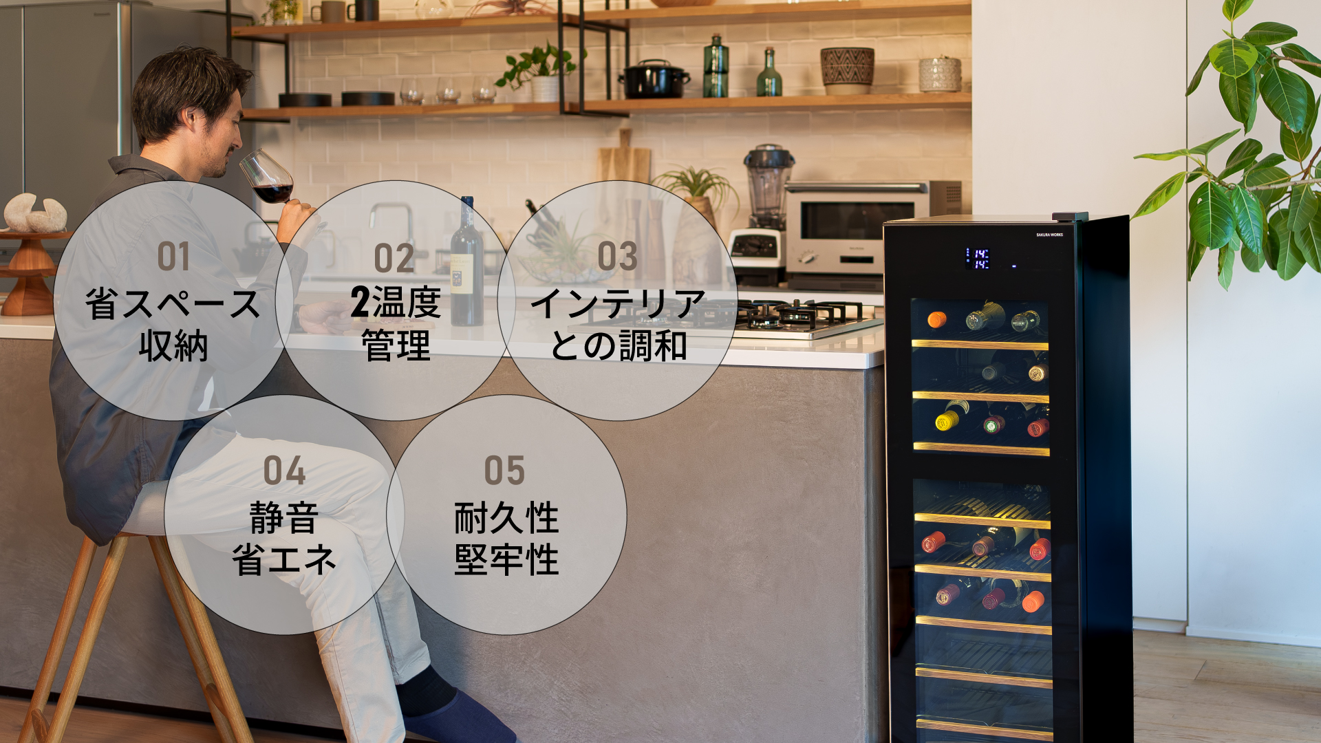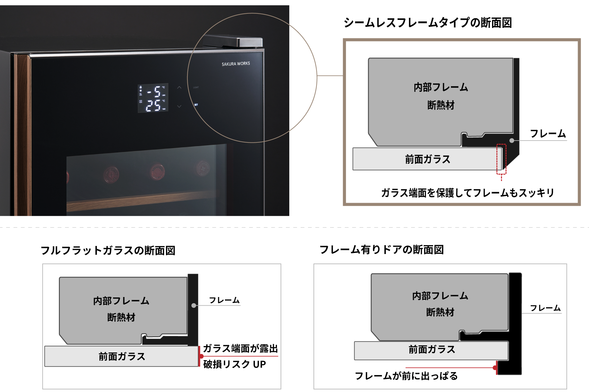 一方、従来型フレームは端面保護に優れるものの、前面の出っぱりでドアが分厚く見え、フレーム部のカビも懸念点に。 当社はこのトレードオフをシームレスフレームで解消。デザイン性と耐久性の両立を実現しました。通常使用でガラスが割れることはほとんどありませんが、ワインセラーとしては唯一のガラス保証(6か月)(※2)も付帯しています。