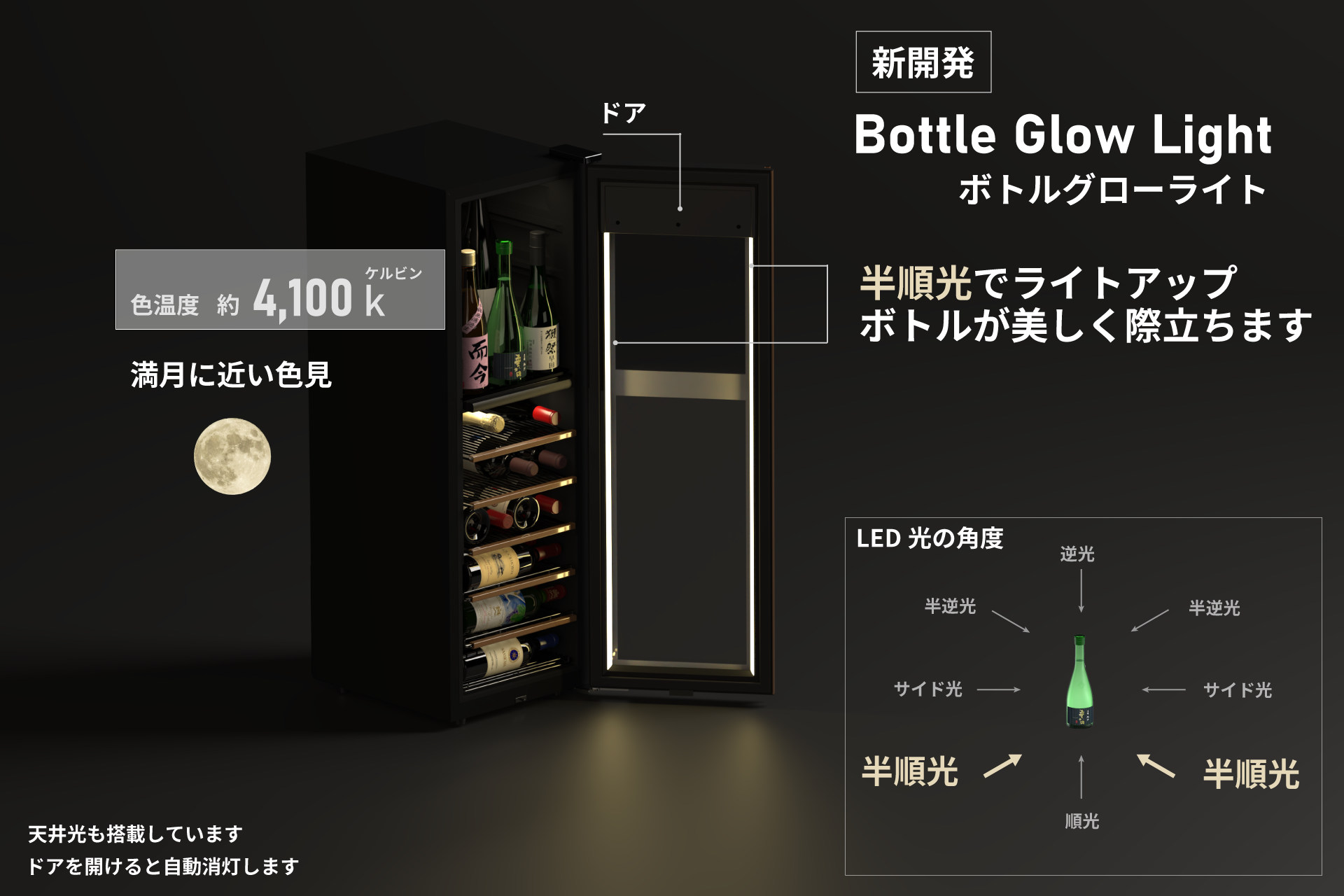 庫内の照明には半順光(※)LEDライトを搭載しました。多くのセラーに見られる半逆光や逆光でのライティングは、眩しさが強調されることでラベルが暗く見えてしまいがちです。氷温M5 GX38では、ボトルの両側から半順光の光源を当て、よりボトル全体をくっきりと鮮やかに照らし出すことにこだわりました。満月のような温かみのある色合いの光を採用しており、お気に入りのコレクションをより美しく演出します。