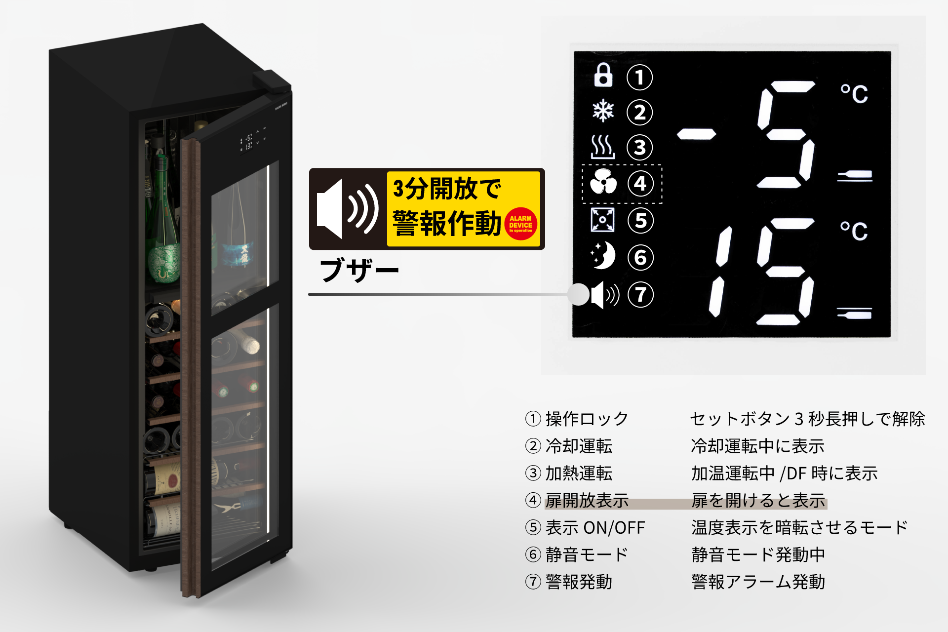 これは隠れた重要機能。理由は、コンプレッサー式ワインセラーも含めた冷蔵機器はドアがわずかに開いたまま気づずに稼働すると、たった1日で300ml以上の水分を吸い込み(※3)ます。その結果、水漏れや床の汚れといったトラブルにつながる恐れがあるからです。 家庭用冷蔵庫では一般的な「ドア開放アラーム」ですが、ワインセラーで搭載されているのは極めて稀。氷温M5にも、ご家庭での安心と快適さを守るために、その機能をしっかり備えています。