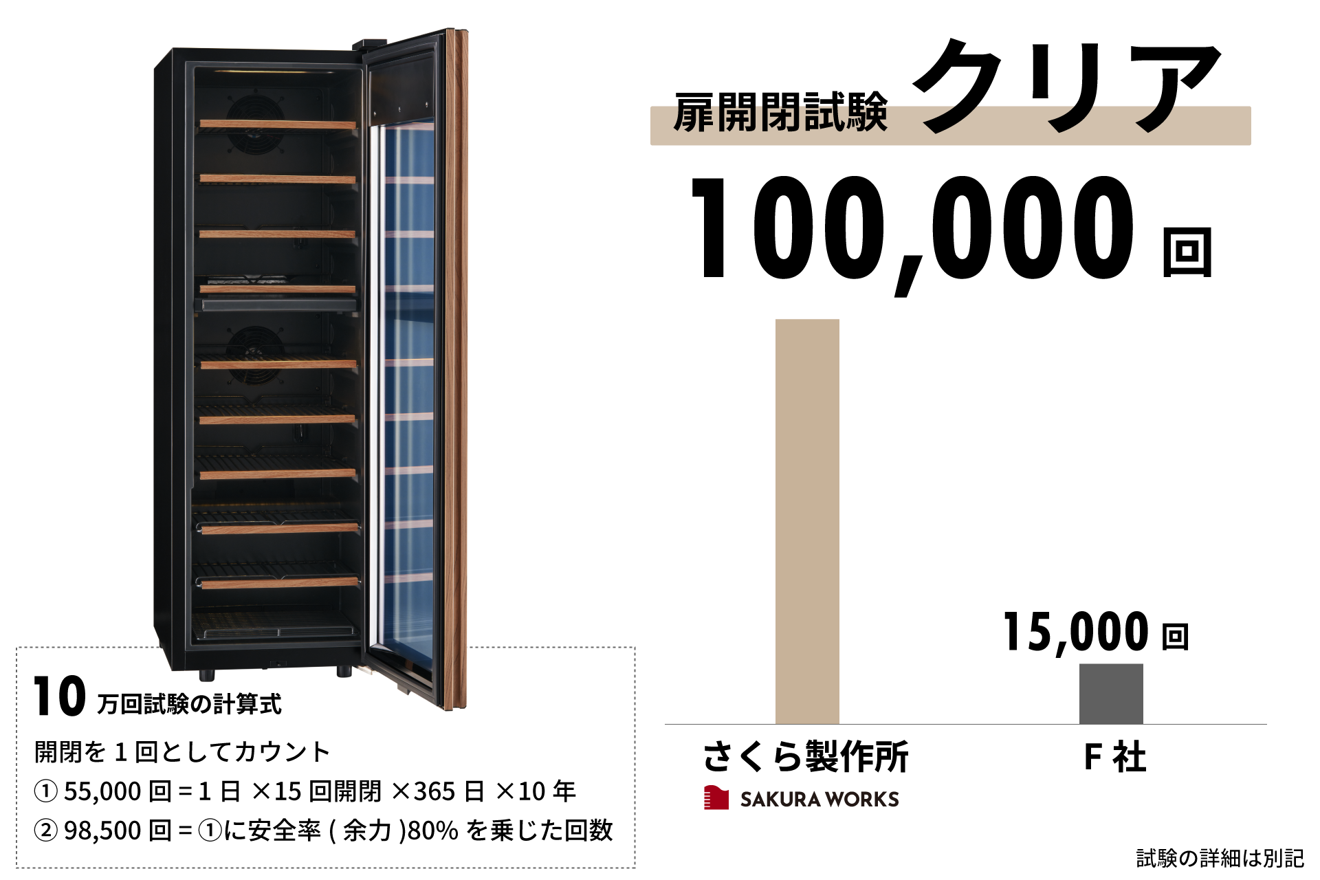 メカニカルアームによる10万回のドア開閉試験に合格。特に日本酒を提供するレストランではワイン以上に開閉頻度が高いため、ヒンジやキャビネット剛性、パッキンには高い強度と耐摩耗性を備えた部材を採用しています。その結果、数年使用してもドアの下がりや摩耗が起きにくい耐久性を確保しました。 さらに、外観部品には長期間の使用でも自然劣化が起きにくい素材を、内部部品には錆や腐食に強い素材を採用。細部に至るまで耐久性を追求し、プロの現場にふさわしい堅牢な品質を実現しています。