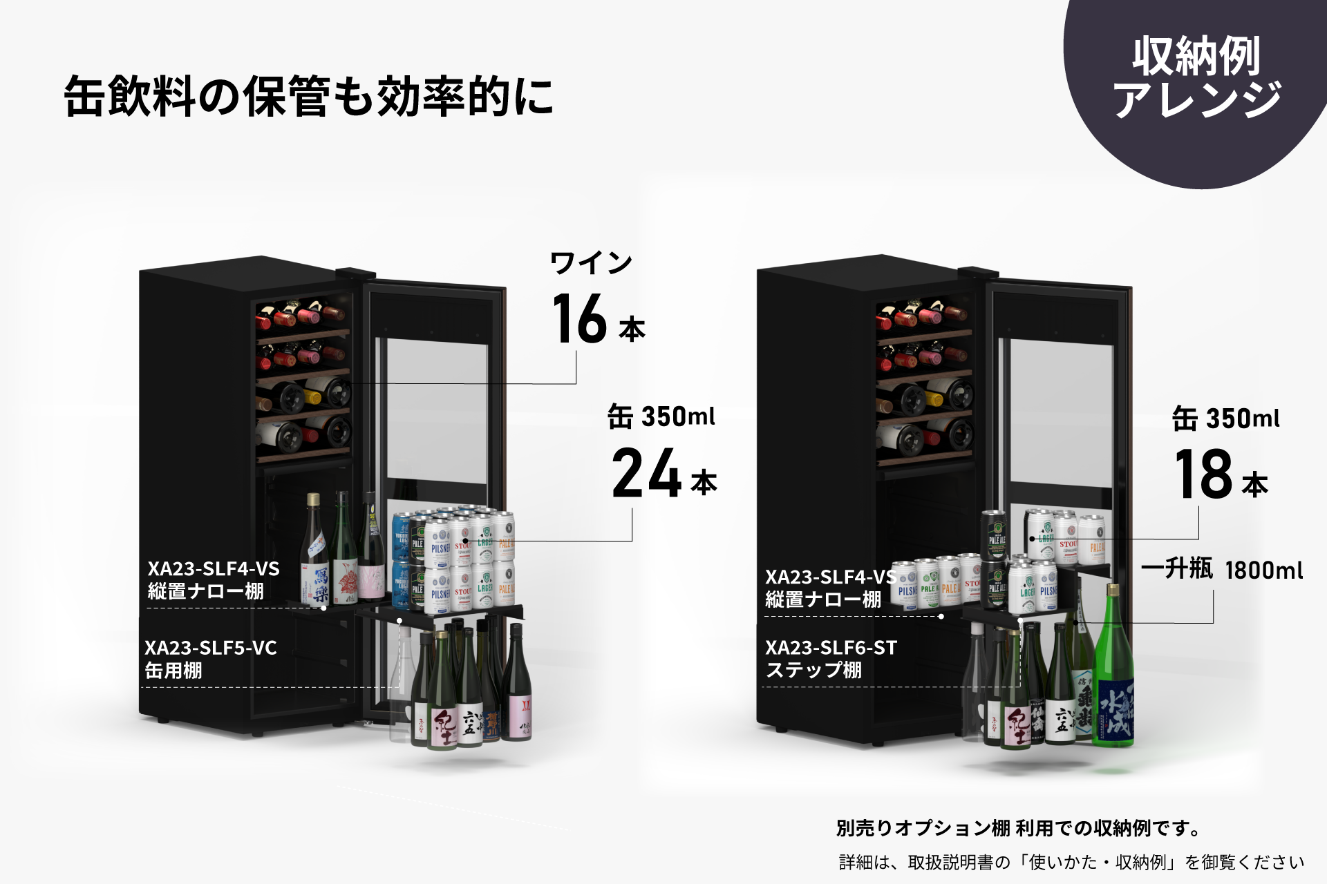 缶飲料をすっきり整理できるオプション棚もご用意。冷蔵庫では難しい、缶ビールの“キンとした冷え”と日本酒の氷温保管を同時に叶えられる便利な棚です。温度帯を分けるのではなく、同じ温度でお酒の種類を整理して楽しみたい方に最適。 さらに、庫内のデッドスペースを有効活用するナロー棚、一升瓶や4合瓶、缶ビールを美しく収められるステップ棚など、多彩な棚をラインナップ。シーンやスタイルに合わせて、より自由な保管が可能です。