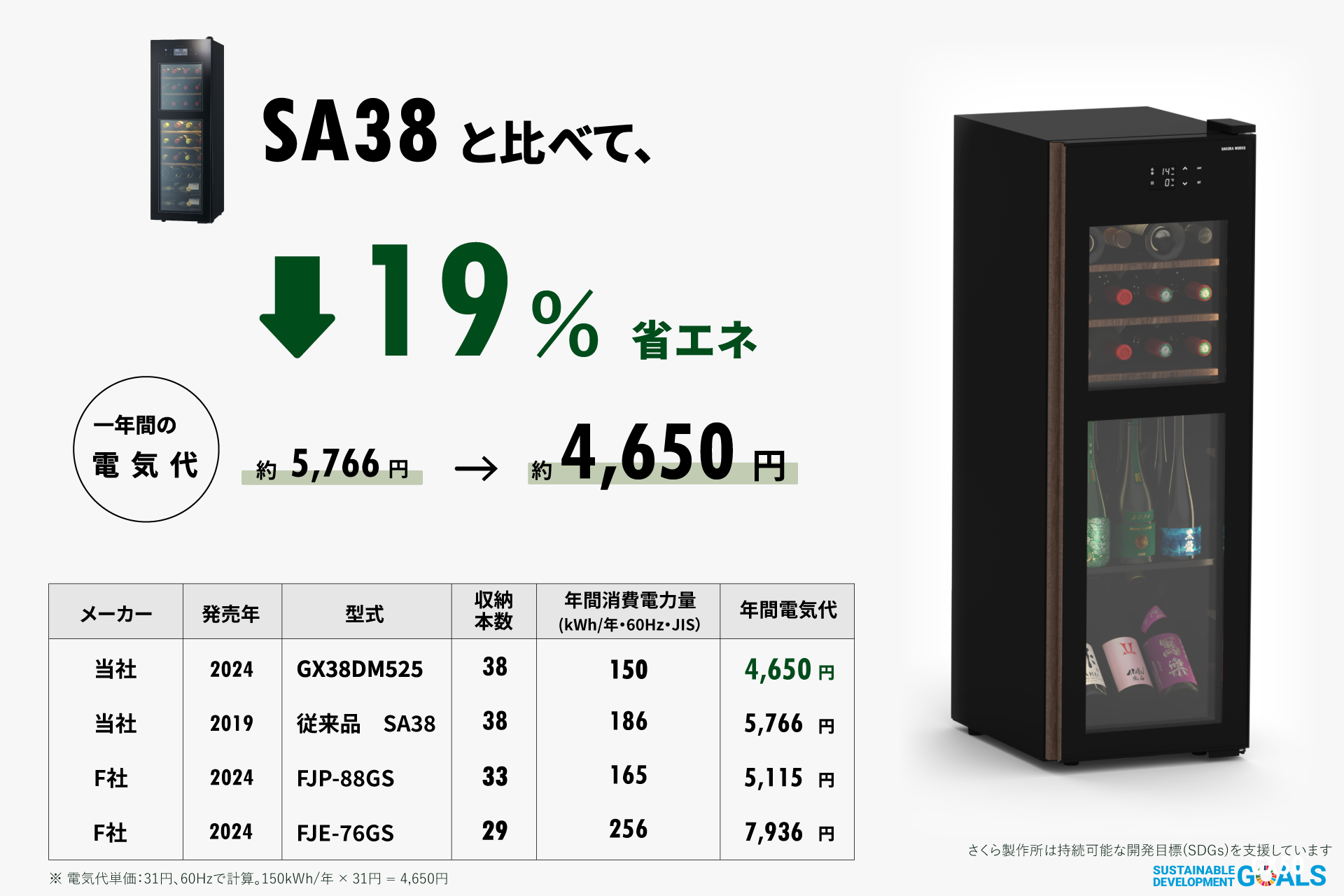 冷却サイクルの再設計により冷却時間も短縮し、消費電力を大幅に削減しました。前回モデルのZERO Advanceシリーズ SA38と比較して、最大約19%の省エネ化を実現しています。年間の電気代も約4,650円ほどと、ランニングコストも抑えられます。