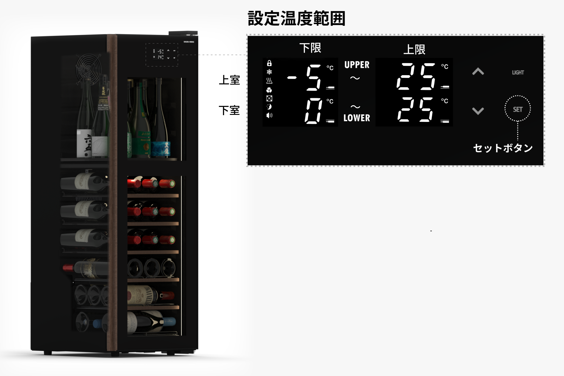 | 設定温度 | 上室 ‐5~25℃ 下室 0~25℃ | |