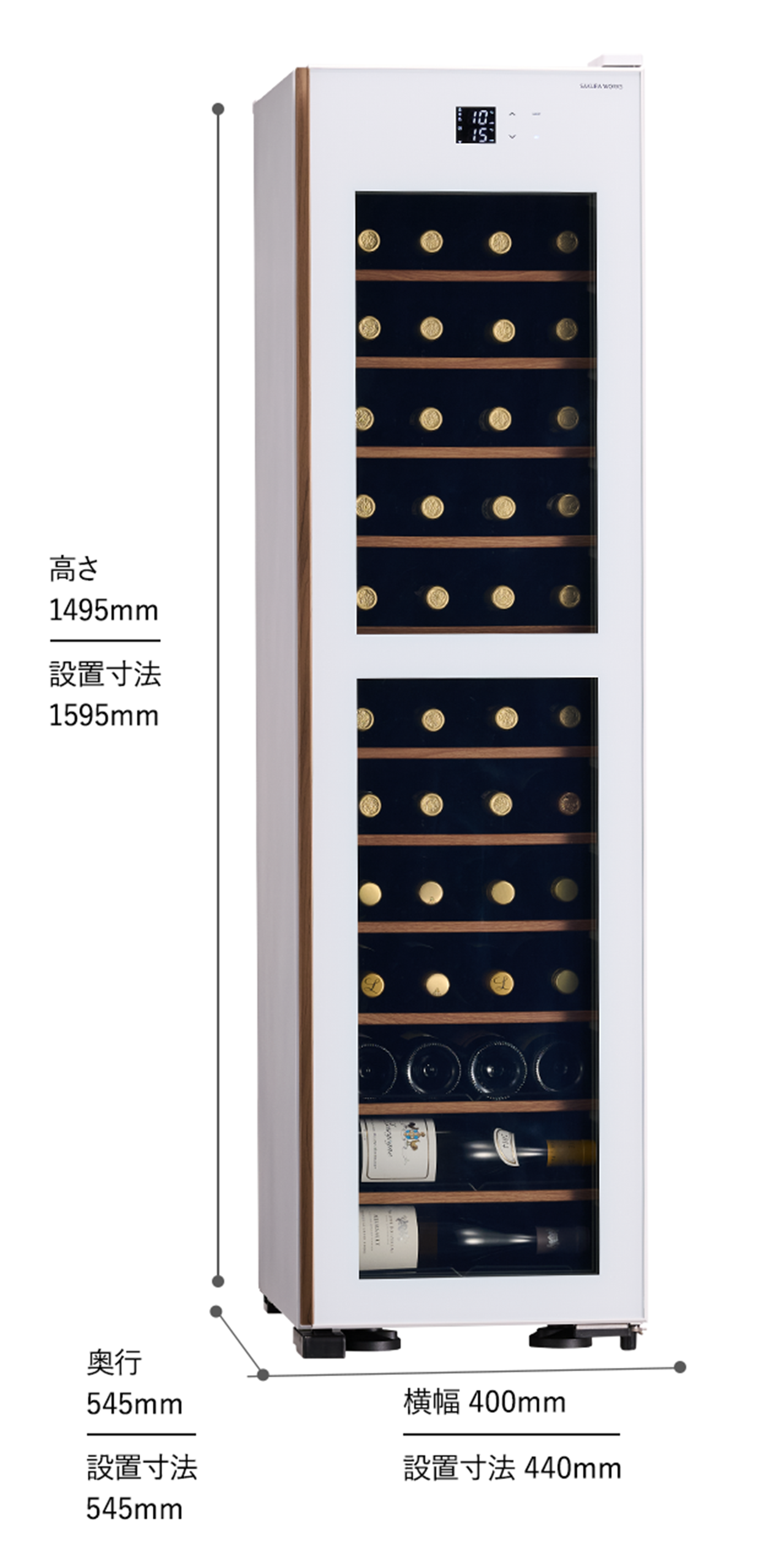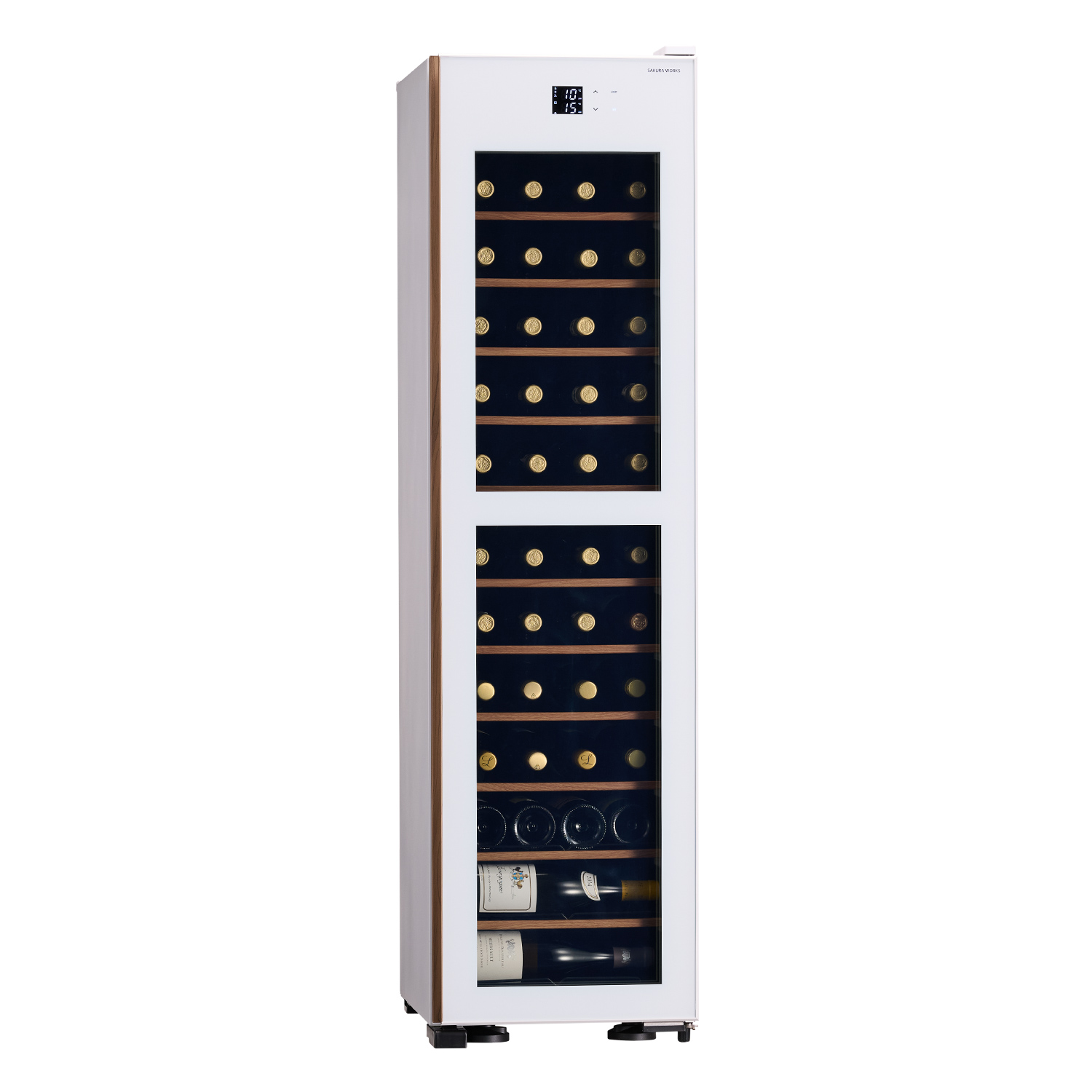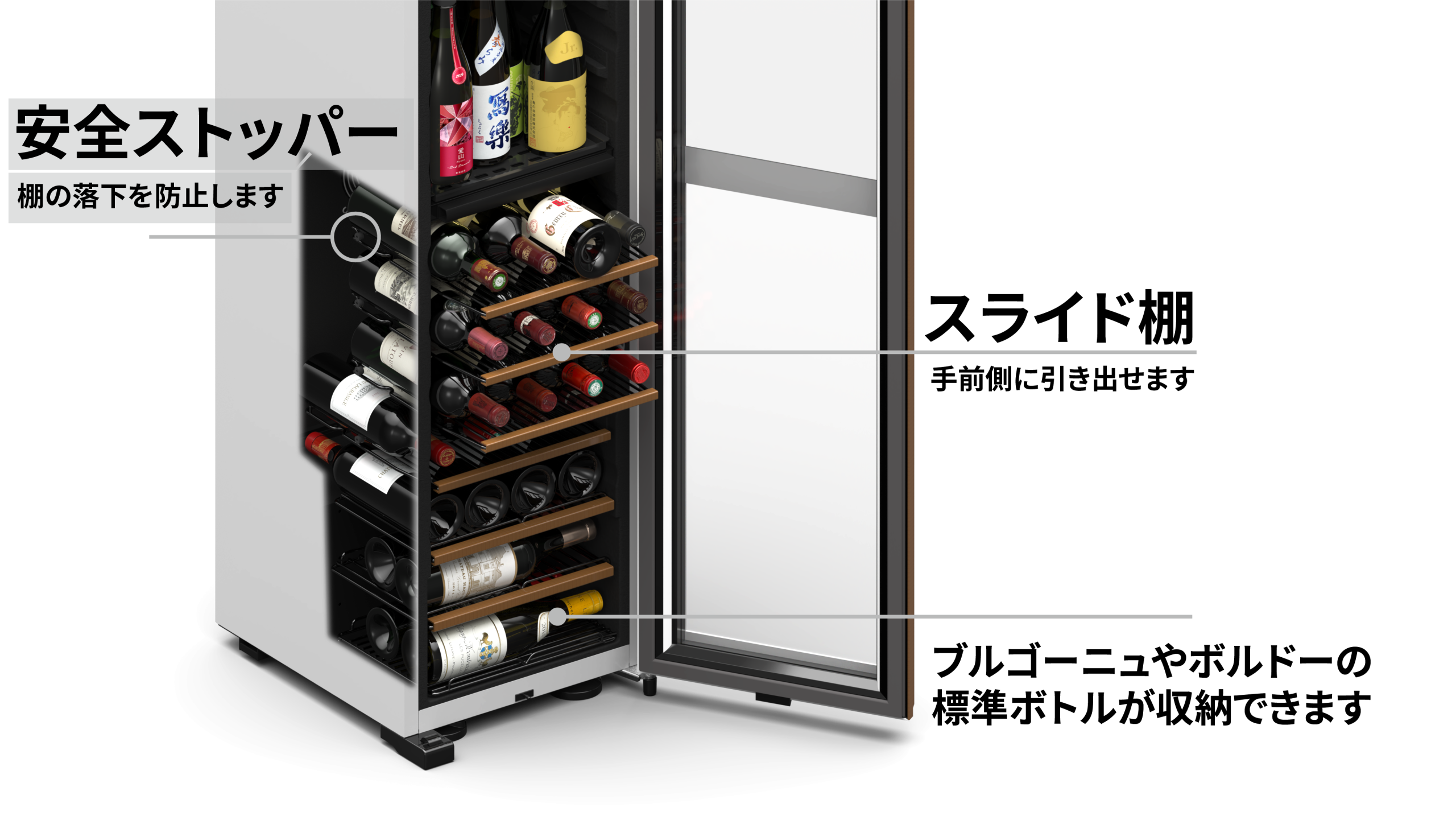 シャンパーニュやブルゴーニュなど、一般的なセラーでは出し入れしにくい太めのボトルもストレスなく収まります。ボルドー、ブルゴーニュ、シャンパーニュなど形状の異なるボトルでも1列に収納できるため、レイアウトの美しさはもちろん、従来よりも効率的にお酒を収納することが可能です。見た目の整然さと使いやすさを両立した、ワイン愛好家やプロのソムリエにもご満足いただけるセラーです。