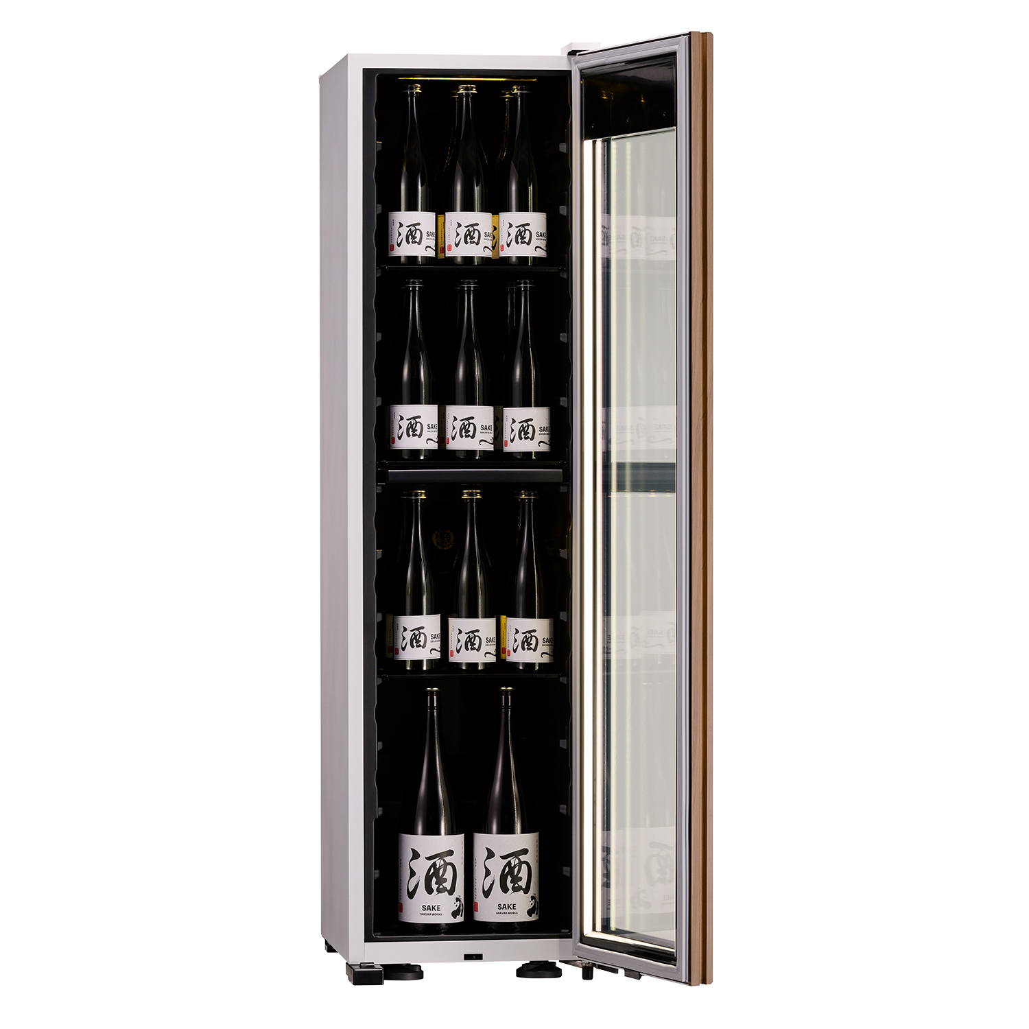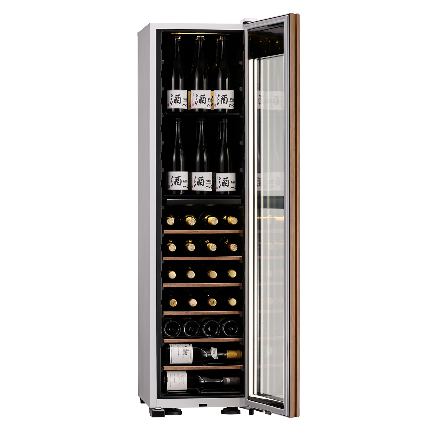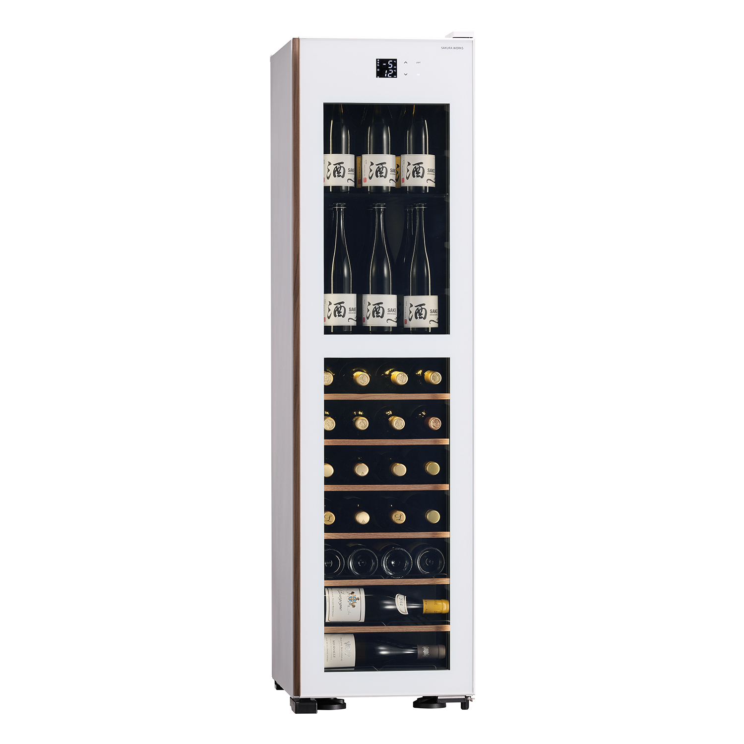 オプション棚を使えば、4合瓶を40本から最大51本まで収められます。上下で温度を変えられる二室構造なので、異なるタイプの日本酒もそれぞれの最適な温度で保存可能。氷温®熟成という贅沢な時間も、ご自宅でお楽しみいただけます。背の高いシャンパーニュボトルも縦置きで保管したいという声に応え、ボトルの高さ・太さの違いにも柔軟に対応できます。「何本入るかわからない」「うまく収まらない」といった悩みを軽減し、実用性と美しさを両立しました。