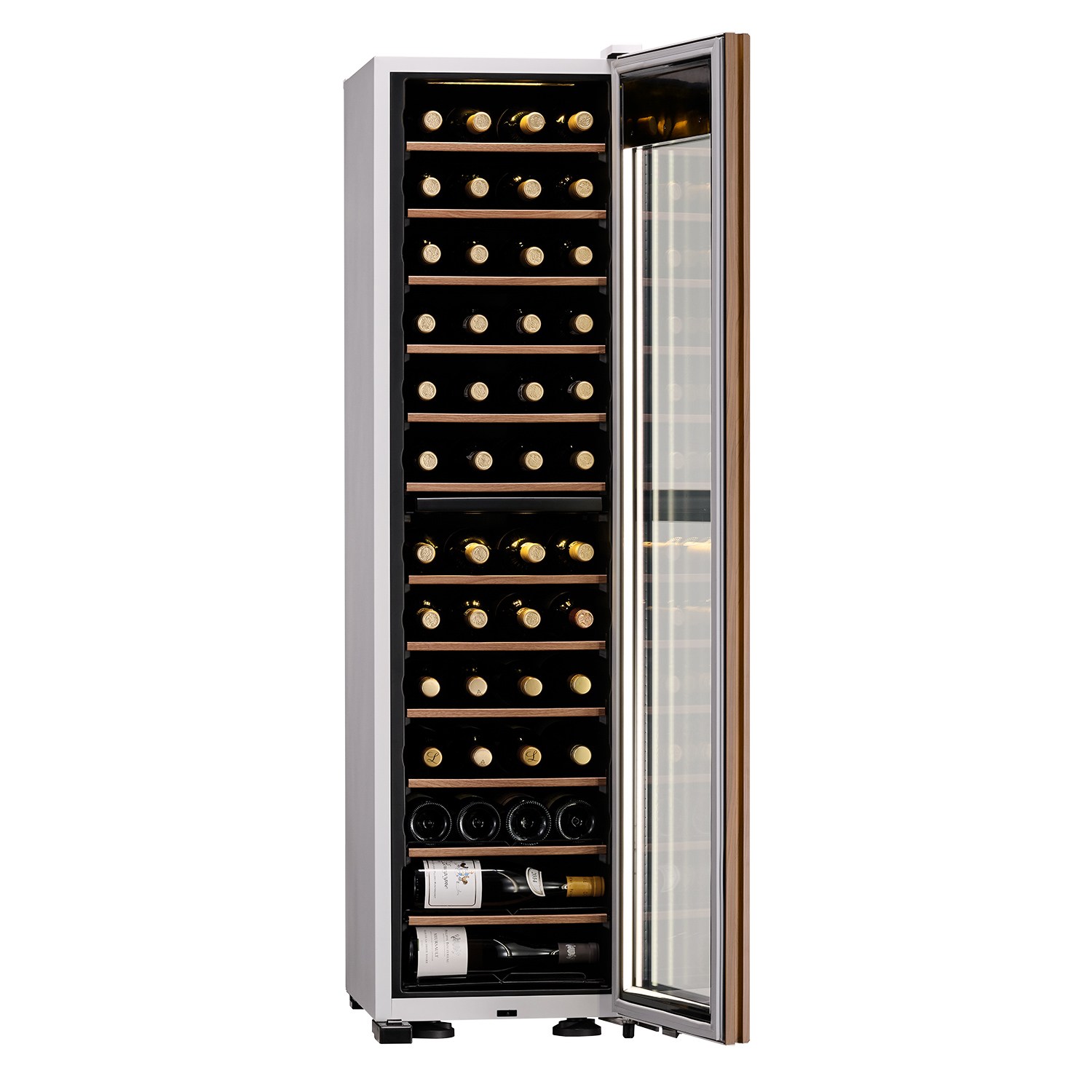 棚を手前に引き出せるスライド仕様で、ボトルの出し入れが簡単にできます。シャンパーニュなど太めのボトルも、ラベルを傷つけずに収納可能です。さらに、ドアを開けると庫内の照明が自動点灯する機能も搭載。ワイン好きの方の使いやすさを考えた機能が詰まっています。