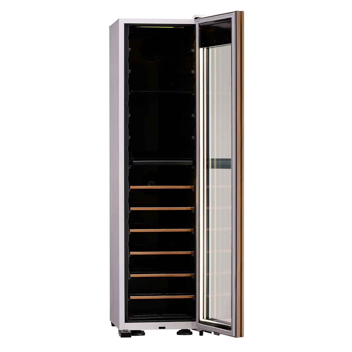 ガラスドアは、ワインや日本酒の保管に欠かせないアイテムです。3枚ガラス構成(T4 + Ar12 + T4L + Ar12 + T4L)を採用し、Ug値約0.66W/(m²·K)という住宅用高断熱窓にも匹敵する性能を実現しました。2層のアルゴンガスと2面のLow-Eコーティングガラスが、外気温の影響を徹底的に遮断。庫内温度の安定性を高め、繊細な熟成や保冷環境を保ち続けます。さらにドアヒーターを搭載してガラス表面の結露の発生を抑え、クリアな視界と美しいディスプレイ性も両立。冷却負荷を軽減することで省エネ効果も期待できます。見せる楽しみと守る安心、その両方を一枚のドアに凝縮しました。