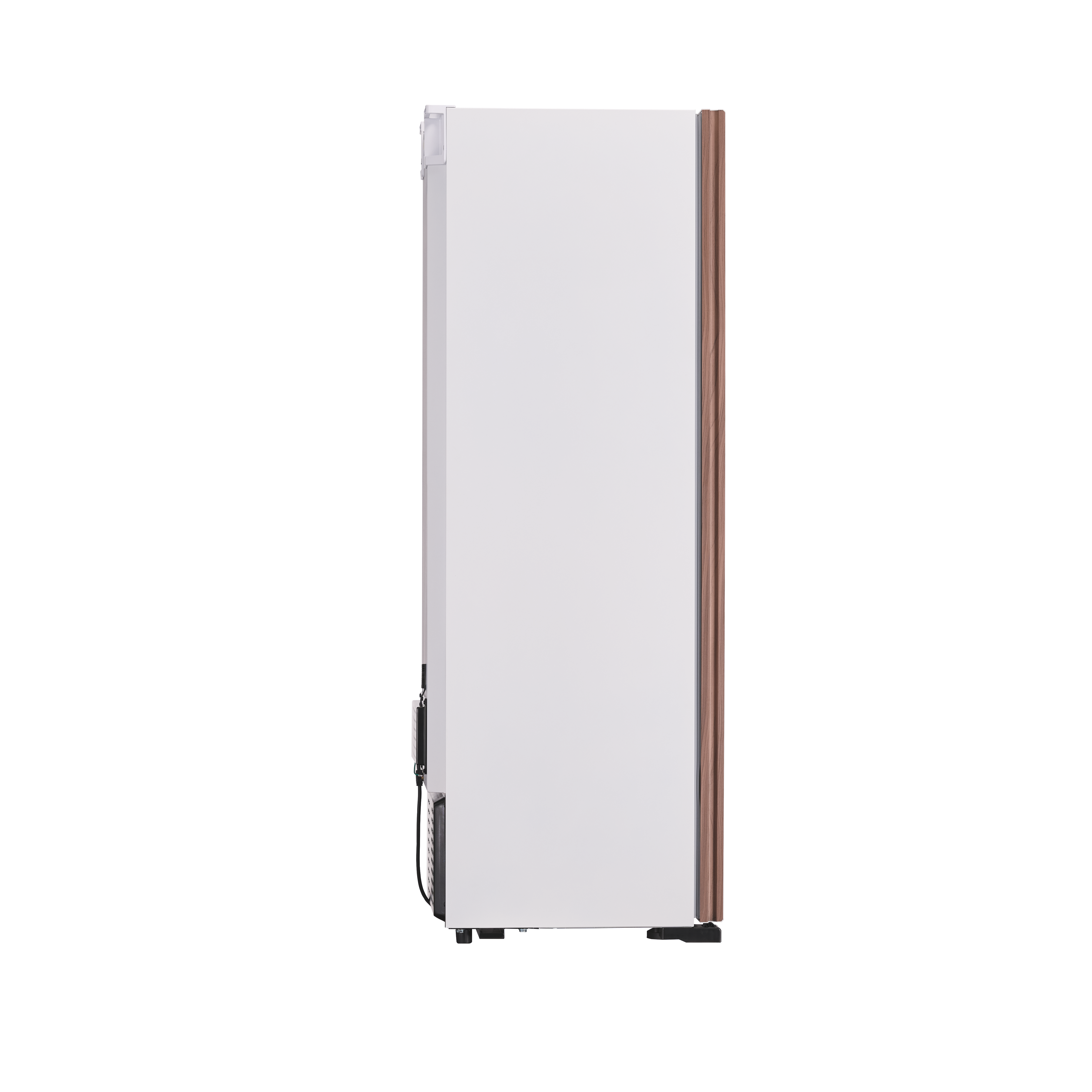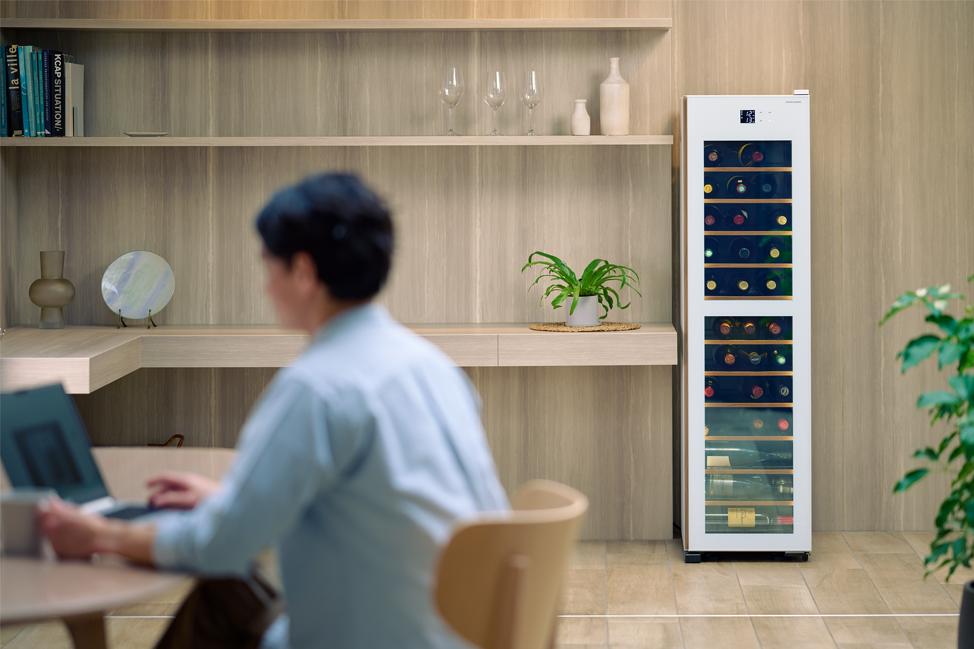 しっくりと部屋になじみ、静かです。前面は白でも側面は黒、というデザインが多い中、このセラーは側面も白!持ち手にはウォールナットが使われていて、柔らかい印象も感じます。背面も壁にぴったり付けられ、非常に省スペース。設置してみたところ、白と木基調の部屋にしっくりと馴染み溶け込んで、ワインセラー特有の圧迫感をまるで感じません。心配していた音も静かで、寝室に置いてもほとんど気にならないのではないでしょうか。ワインセラーが欲しいと数年悩みつつも、デザインが気に入らず購入に至りませんでしたが、これまで待っていてよかった!と思えた製品でした。( 兵庫県在住 ご自宅使用 40代女性 Cさん)