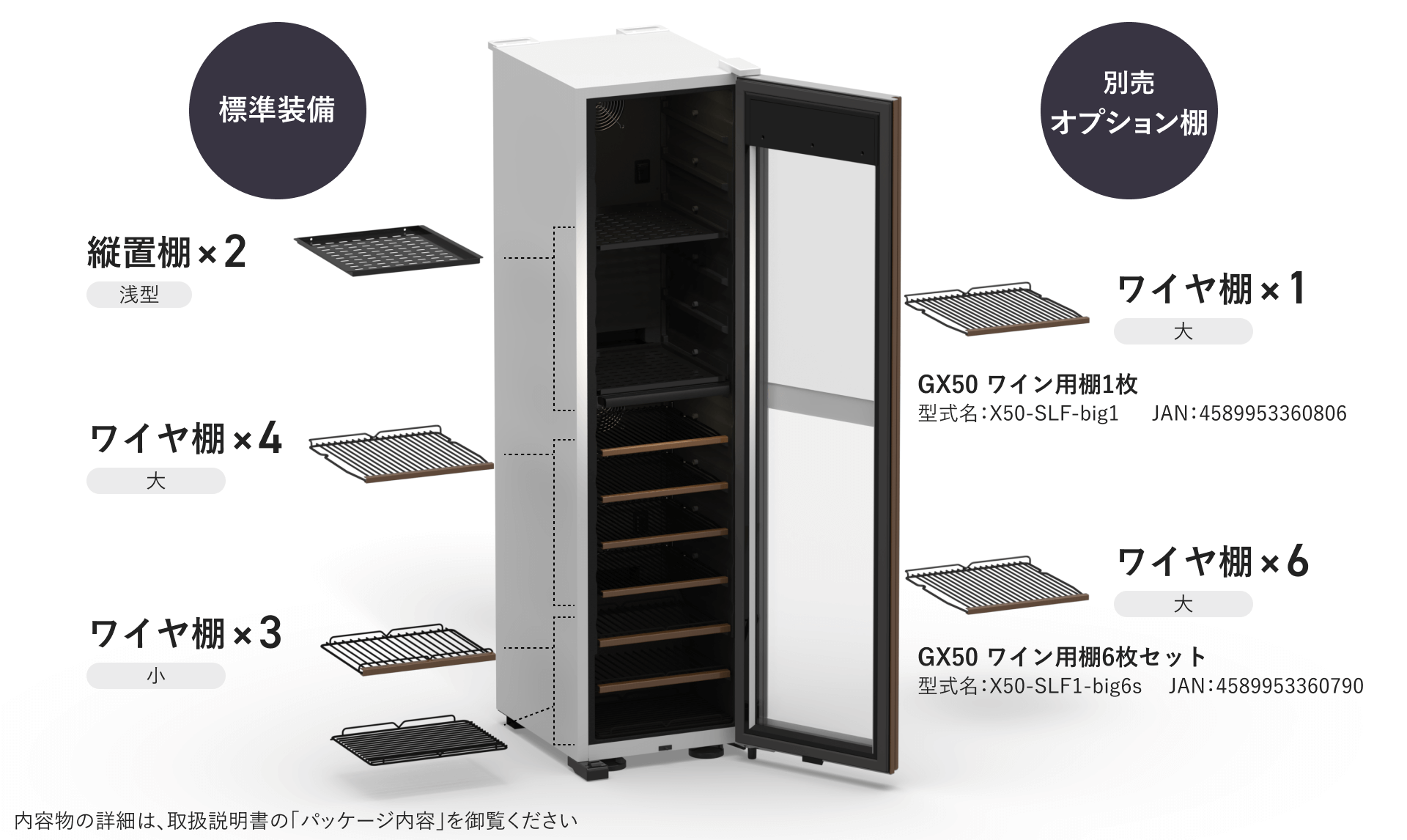 | 付属棚の枚数 | 棚大:4枚 棚小:3枚 縦置棚:2枚 (ワインフル収納時は棚大6枚セットの購入が必要です) |