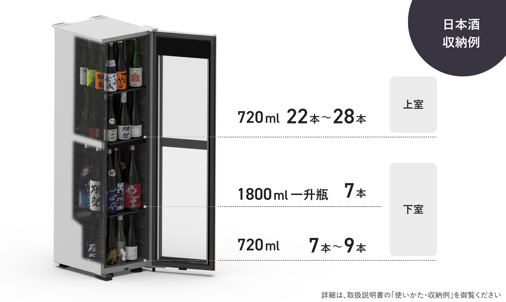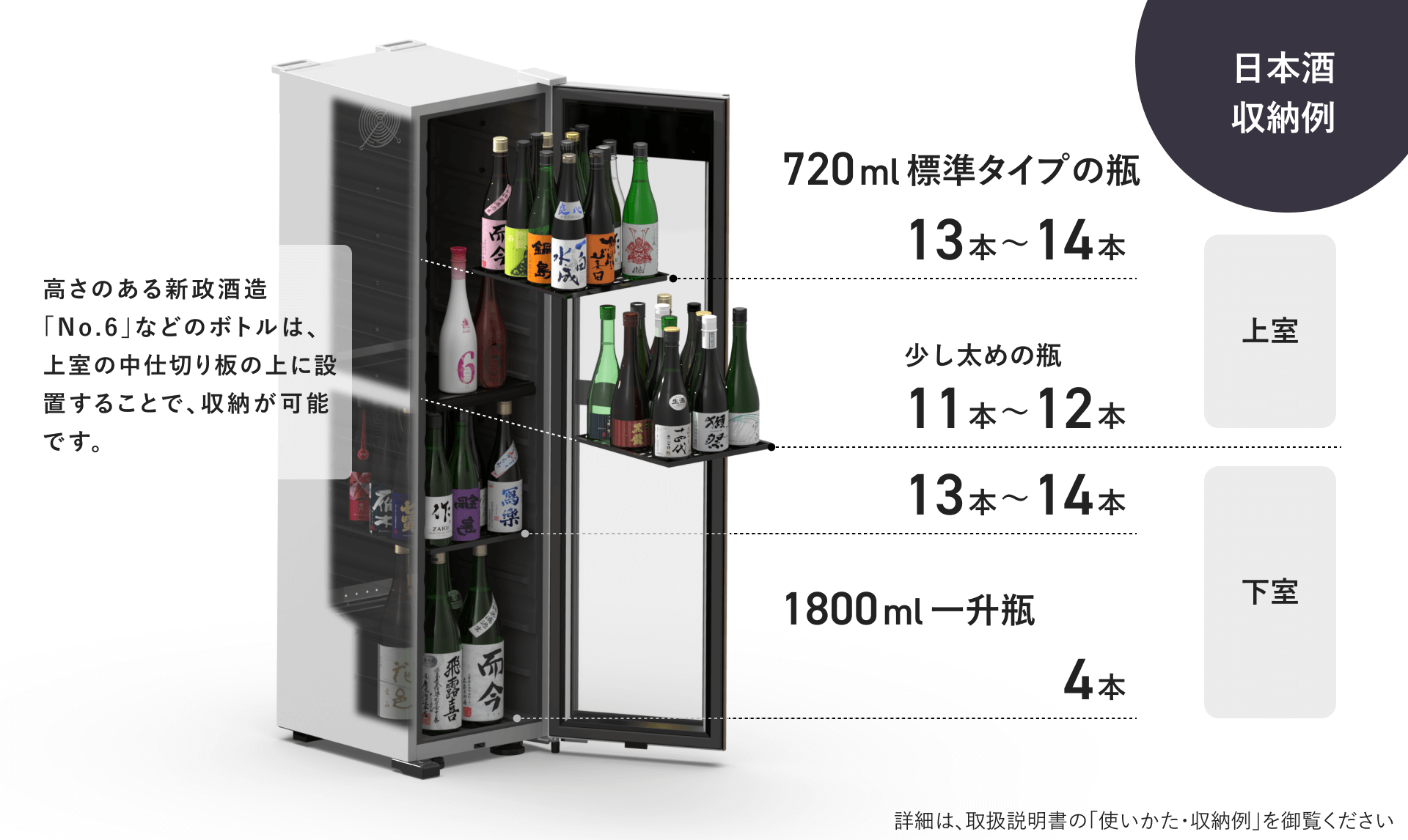 | 収納本数(一升瓶) | 14本(一升瓶) 40~51本(4合瓶) | |