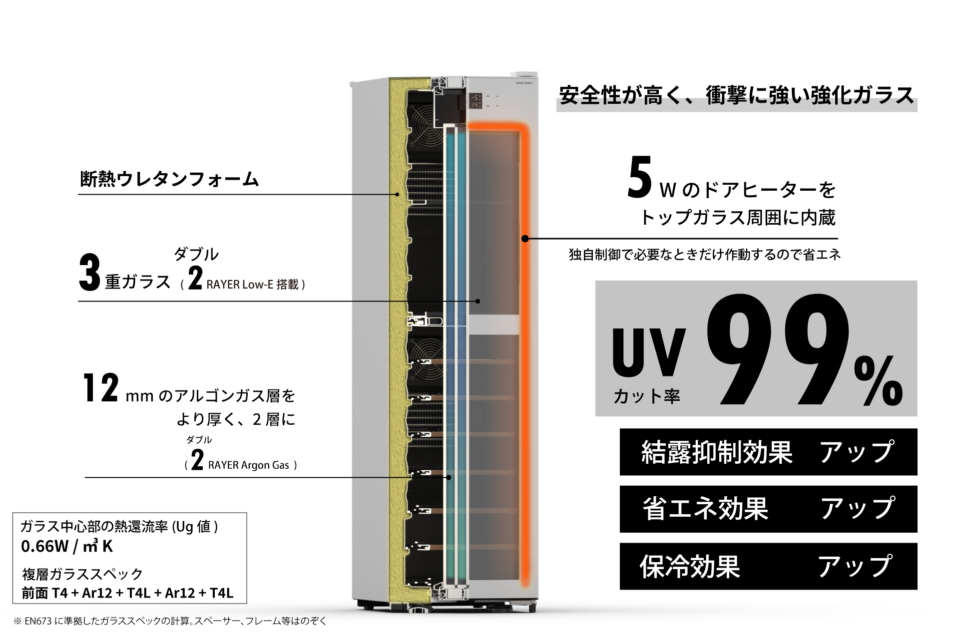 | 扉の構造 | 3層ガラス (強化ガラス+アルゴンガス+強化ガラスLow-E+アルゴンガス+強化ガラスLow-E) ※ガラスの熱還流率:0.660 W/㎡K ※フレームおよび操作部分を除くためドア全体の熱還流率ではありません。 |