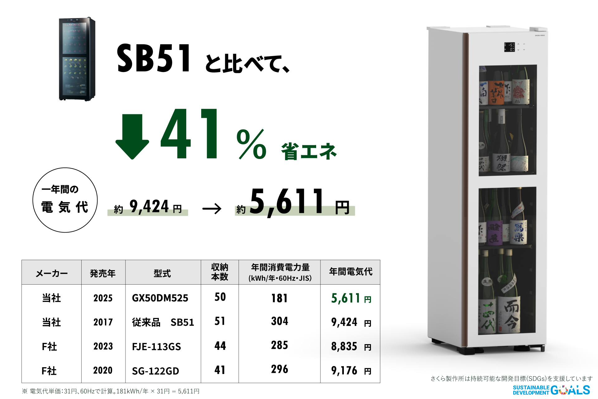 冷却サイクルの再設計により冷却時間も短縮し、消費電力を大幅に削減しました。前回モデルのSB51シリーズと比較して、最大約41%の省エネ化を実現しています。年間の電気代も約5,610円ほどと、ランニングコストも抑えられます。