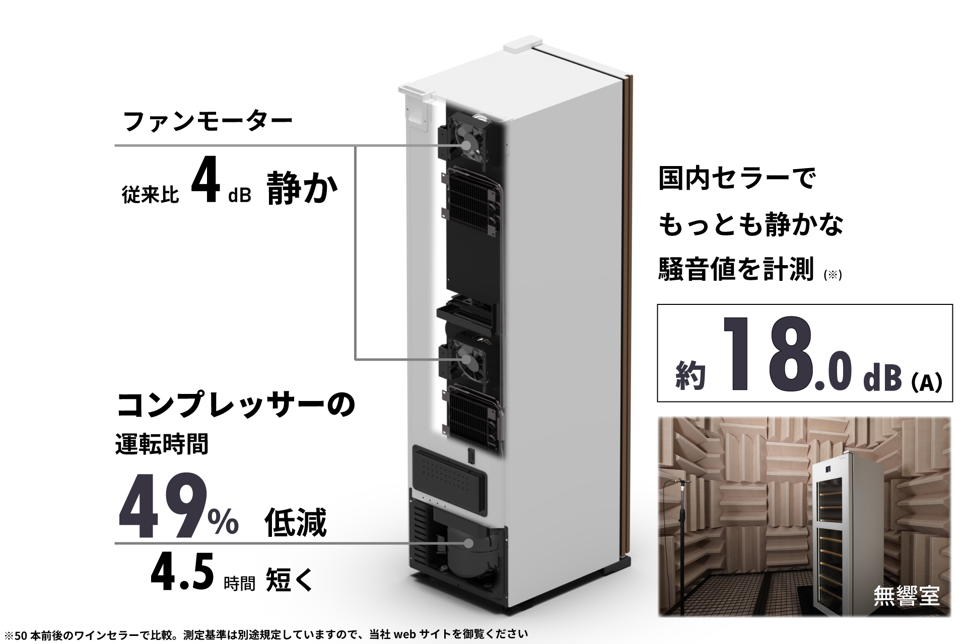 昨年に続き3台目を購入。静音性が高く、オーディオ環境にも最適です。以前使っていたペルチェ素子タイプは冷却力が落ち、猛暑に耐えられず買い替えました。本機は冷却力が高く、コンプレッサー音も短時間で気になりません。湿度も60~75%と安定し、熟成・日常使いの両方に最適です。( 東京都在住 ご自宅使用 40代男性 Aさん)