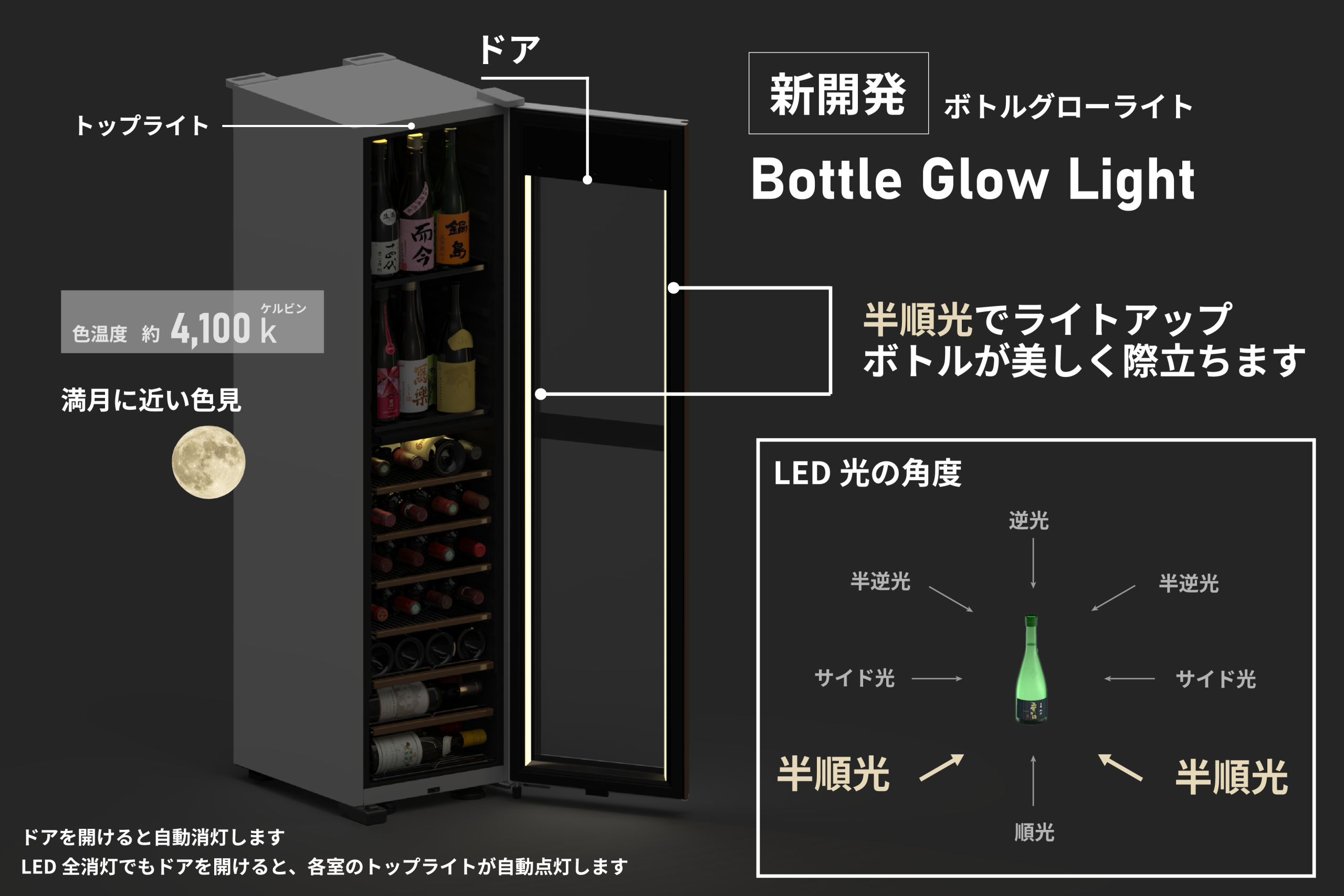 庫内の照明には半順光(※1)LEDライトを搭載しました。多くのセラーに見られる半逆光や逆光でのライティングは、眩しさが強調されることでラベルが暗く見えてしまいがちです。氷温M5GX38では、ボトルの両側から半順光の光源を当て、よりボトル全体をくっきりと鮮やかに照らし出すことにこだわりました。満月のような温かみのある色合いの光を採用しており、お気に入りのコレクションをより美しく演出します。