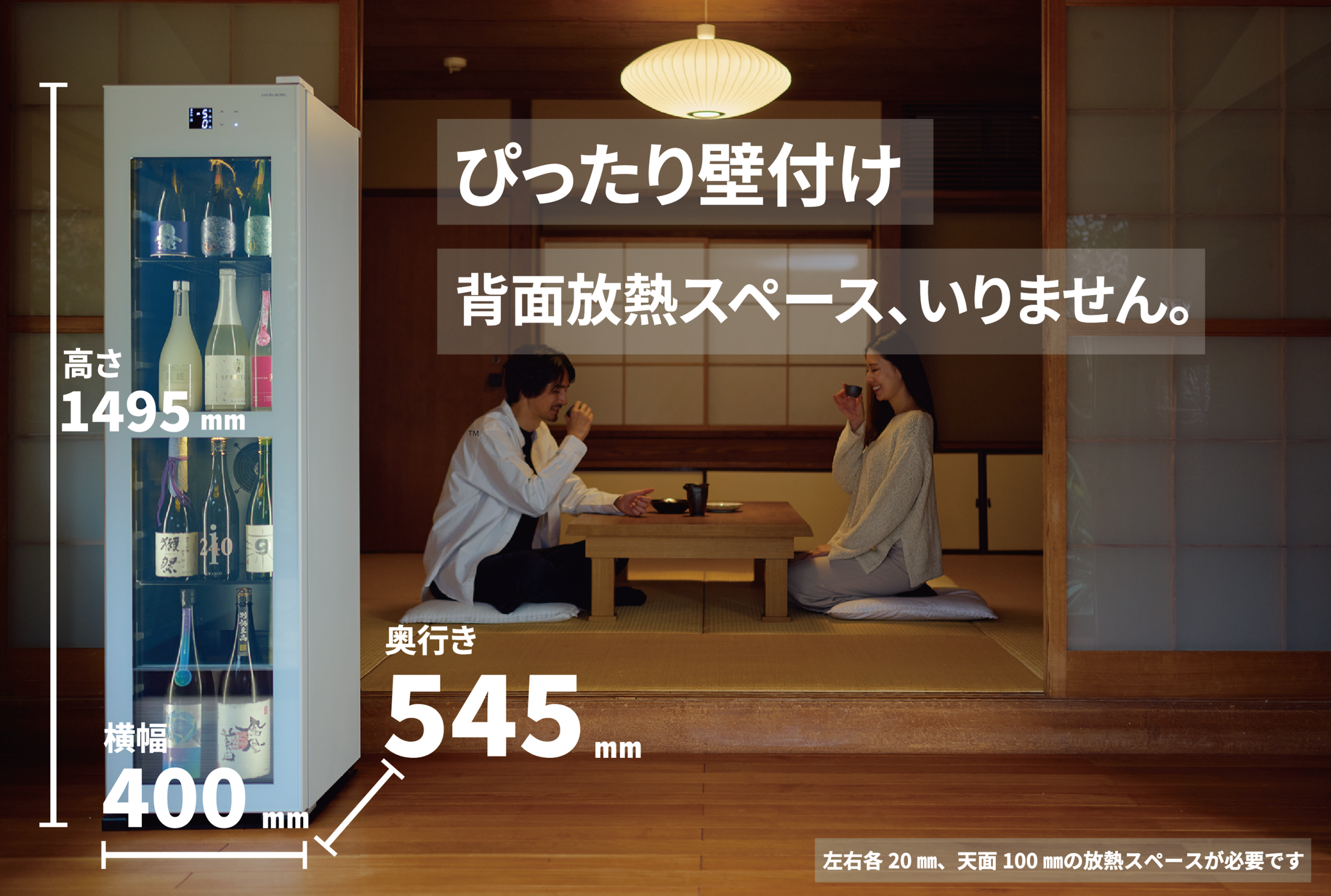 スリムなタワー型で設置面積を最小化。最大50本もの収納力を備えつつ、上下二室の縦型2温度で省スペースのまま高精度な温度管理が可能です。奥行きは545mm、背面は壁にぴったり付けて設置でき、独自の放熱設計でクリアランスを確保。背面に配置した制御基板をコンプレッサー熱から守る安心構造は、特定電気用品の技術基準(菱形PSE、主に業務用ショーケース)を満たしています。
