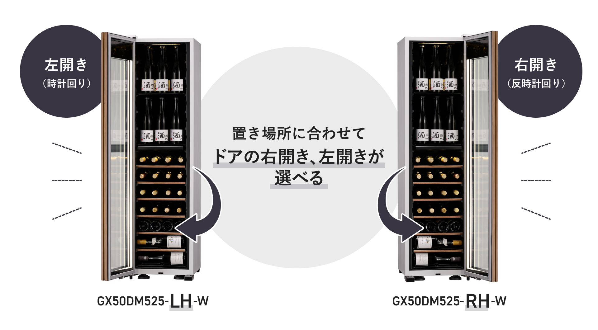 ドアの開閉にもこだわり、右開き・左開きの両モデルを展開しています。これにより、場所を限定しない設置が可能になりました。2台並べて使用すれば、最大100本収納&4つの温度帯を選択して幅広い種類のお酒を管理できます。