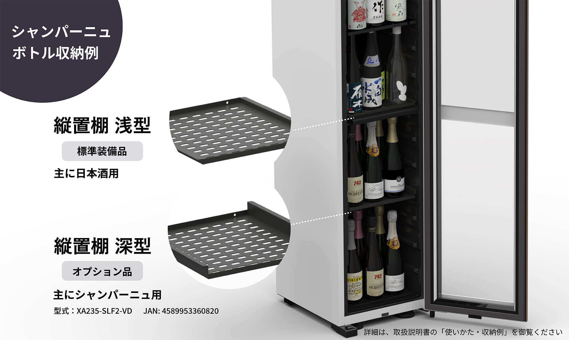 日本酒愛好家からの声を受け、収納棚をリニューアル。従来モデルでは上下室ともにワイン用棚を標準搭載していましたが、GX50では上室を日本酒専用の縦置き棚へ変更しました。必要な方のみ、オプションでワイン用棚(6枚セット、または1枚ずつ)を追加購入いただくことで従来通りのワイン収納も楽しめます。ボトルに合わせて棚をカスタマイズできるため収納性も上がり、ワインも日本酒も一つのセラーで管理できるようになりました。