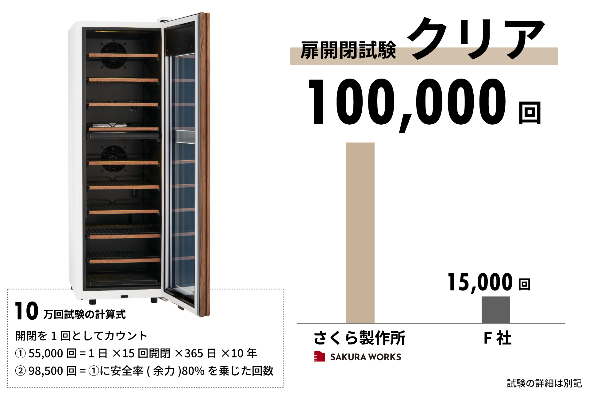 ドアはメカニカルアームを搭載した専用試験機による開閉試験を実施し、10万回の開閉動作をクリアしています。特に日本酒を提供するレストランでは、ワインを主に扱う店舗以上にドアの開閉頻度が高くなります。そのために、日本酒ニーズを想定した強度や耐摩耗性に優れたヒンジ、キャビネット剛性、パッキンのゴム材質を採用。数年使用してもドアの下がりが起こりにくい高い耐久性を確保しています。