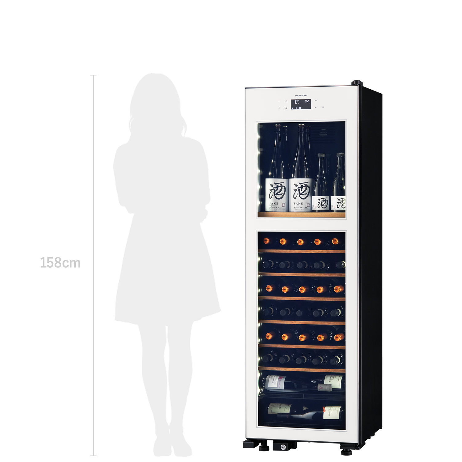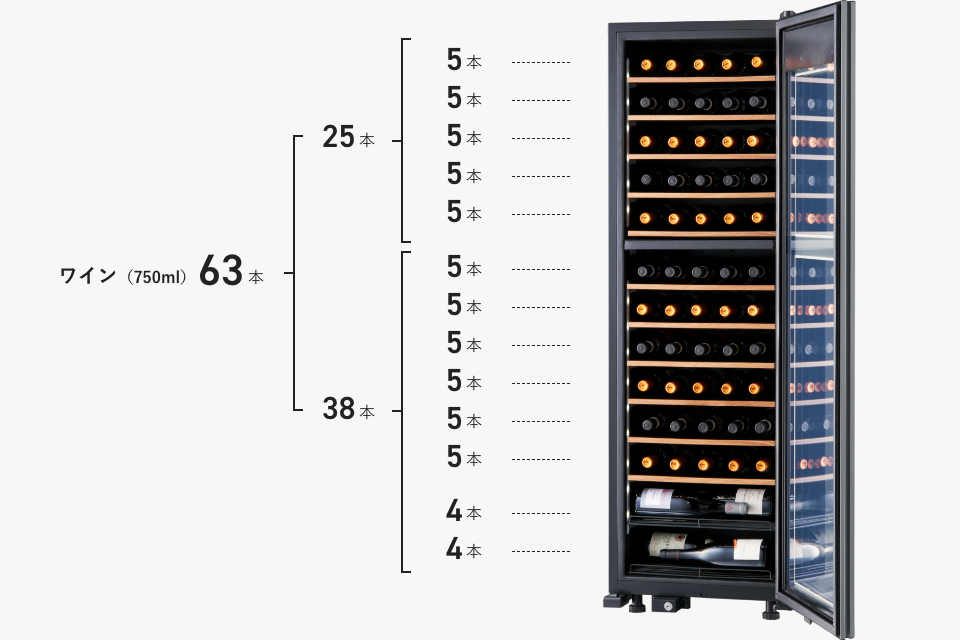 ワインのフルボトルを上室に25本、下室に38本、最大63本収納可能です。開栓して一度で飲み切らなかった日本酒も、立てて収納できる十分なスペースを確保しています。収納力を持たせつつ、横幅約50㎝、高さ約156㎝、奥行約54㎝と省スペース性に配慮した設計。場所を気にせずご自宅に設置していただけます。