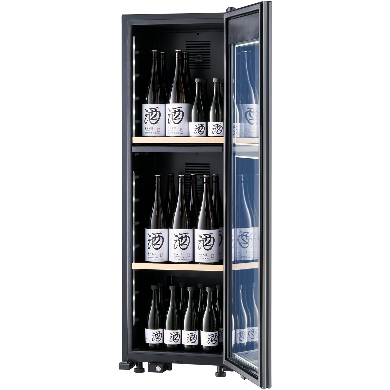 日本酒は一度抜栓した後も、1週間から1か月程度味わいをキープできるので、一升瓶のように大容量のものは一度で飲み切らずに、何日もかけて楽しむ方が多いでしょう。しかし、一般的に日本酒の栓はワインのコルクよりも隙間が生まれやすく、ボトルを寝かせて保管すると液漏れが起きる可能性があります。そこで氷温®M2シリーズでは、栓をあけた後もセラーに戻して保管できるように、ボトルを縦置きできるスペースを広く確保しました。ずらりと並ぶコレクションを、目で見てもお楽しみいただけます。