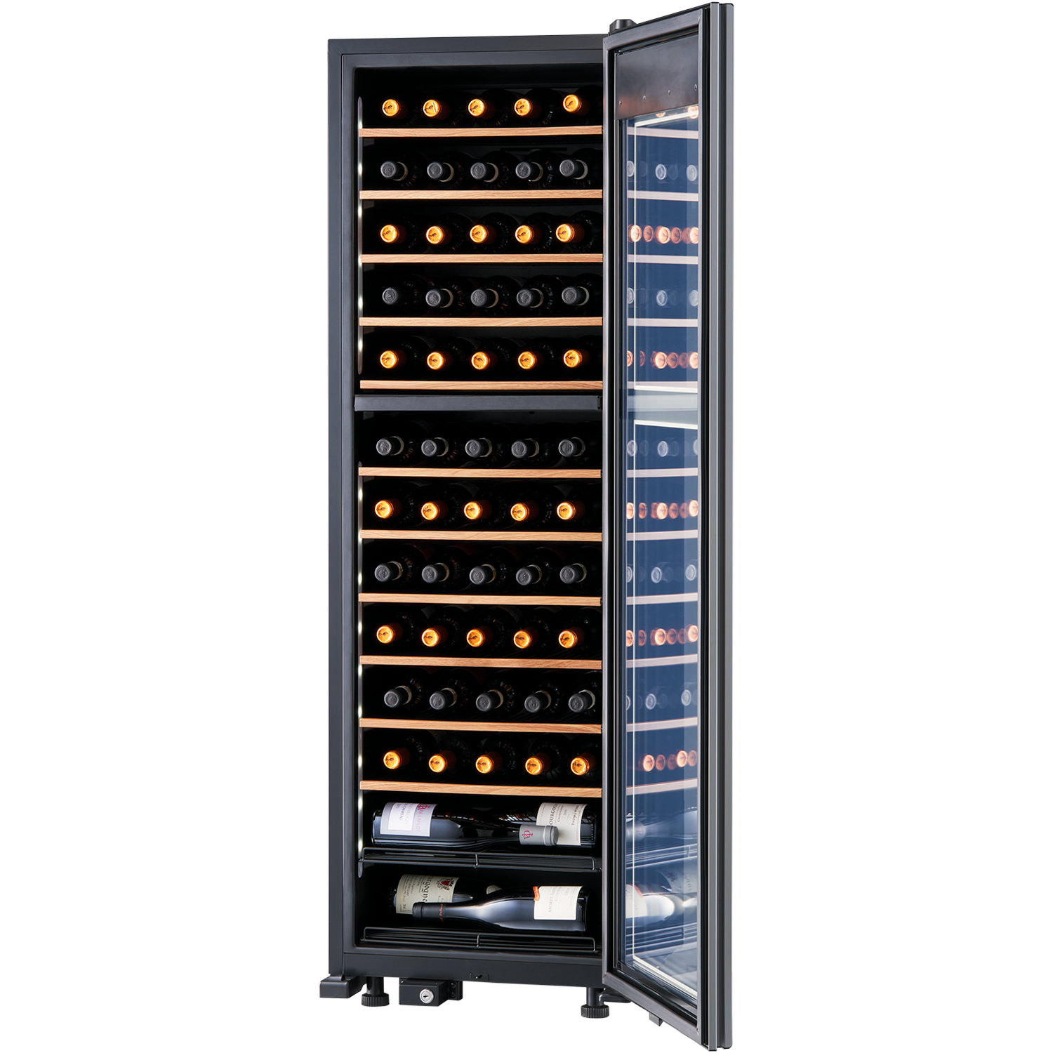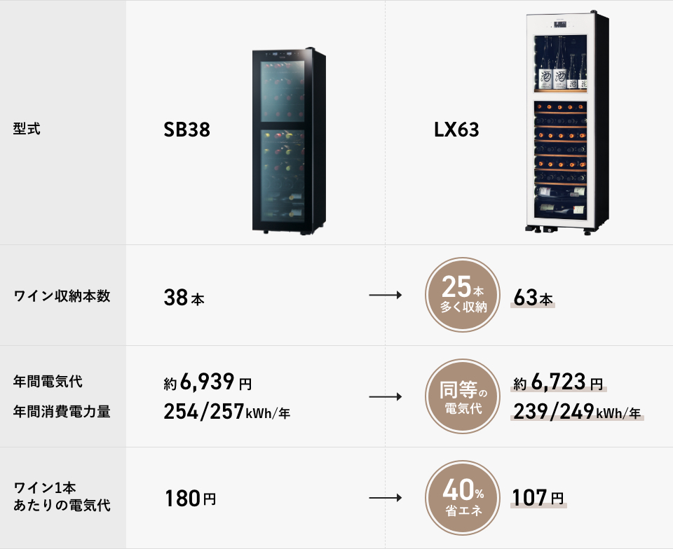 LX63は新しい冷却サイクルや真空断熱ガラスを搭載することで、これまでよりもさらに省エネ性能が高まっています。ワイン63本収納を収納できるLX63は、2017年に発売した38本収納タイプSB38と年間電気代が同等です。ワイン1本を保管する際の電気代に換算すると約40%もの省エネ効果を得られています。