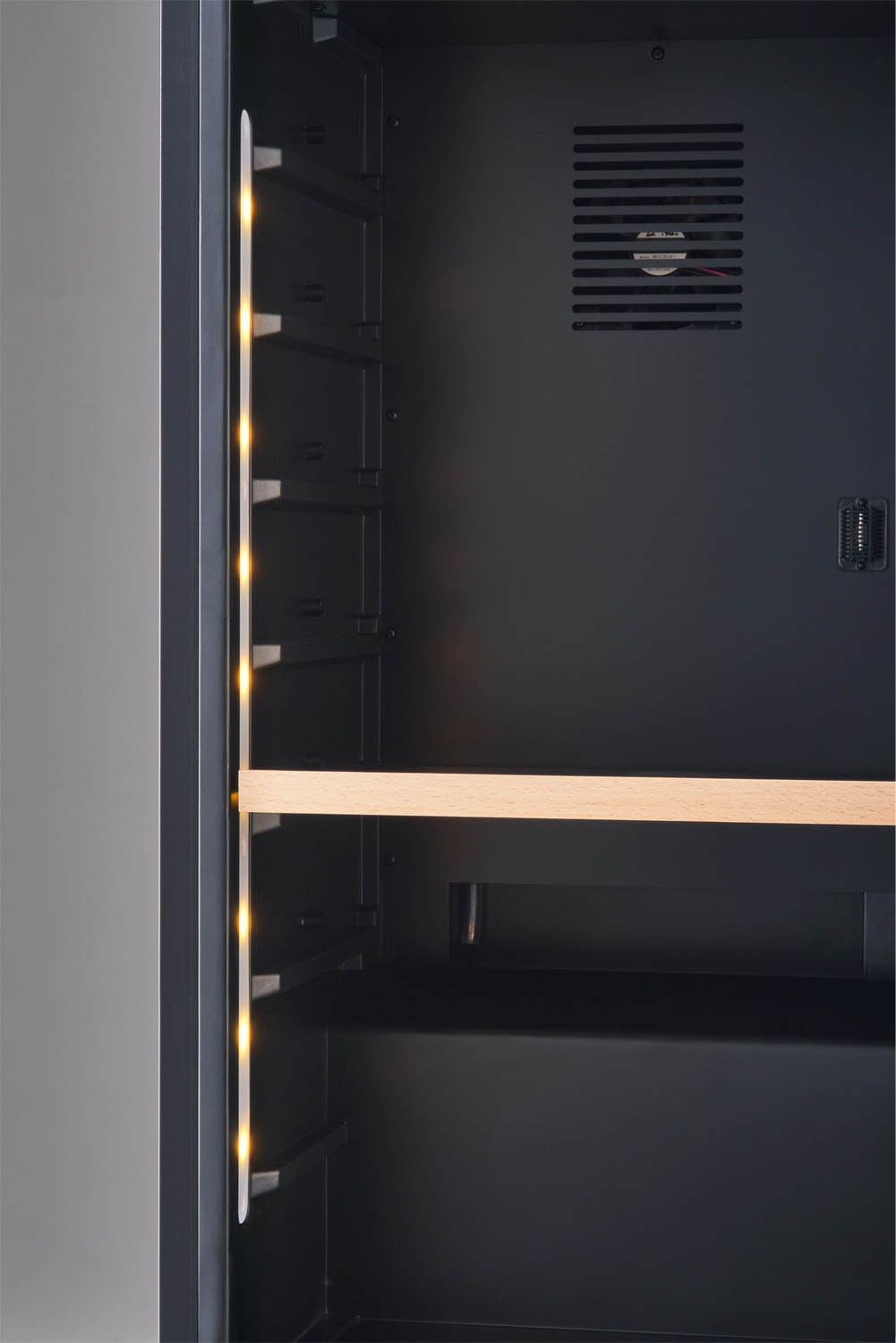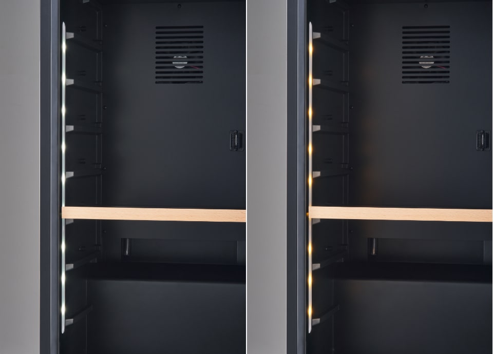 ボトルを縦置きで保管すると、両サイドに縦配置したLEDライトがお酒のラベルをライトアップするようになっています。白色系と暖色系、2つのLEDを搭載しているので、お好みに合わせてスイッチ一つで色味を変えることができます。暖色系だとワインのカーヴのような、白色系だと日本酒のショーケースのようなディスプレイ。お酒を配列する楽しみと、上質な雰囲気を感じていただけます。