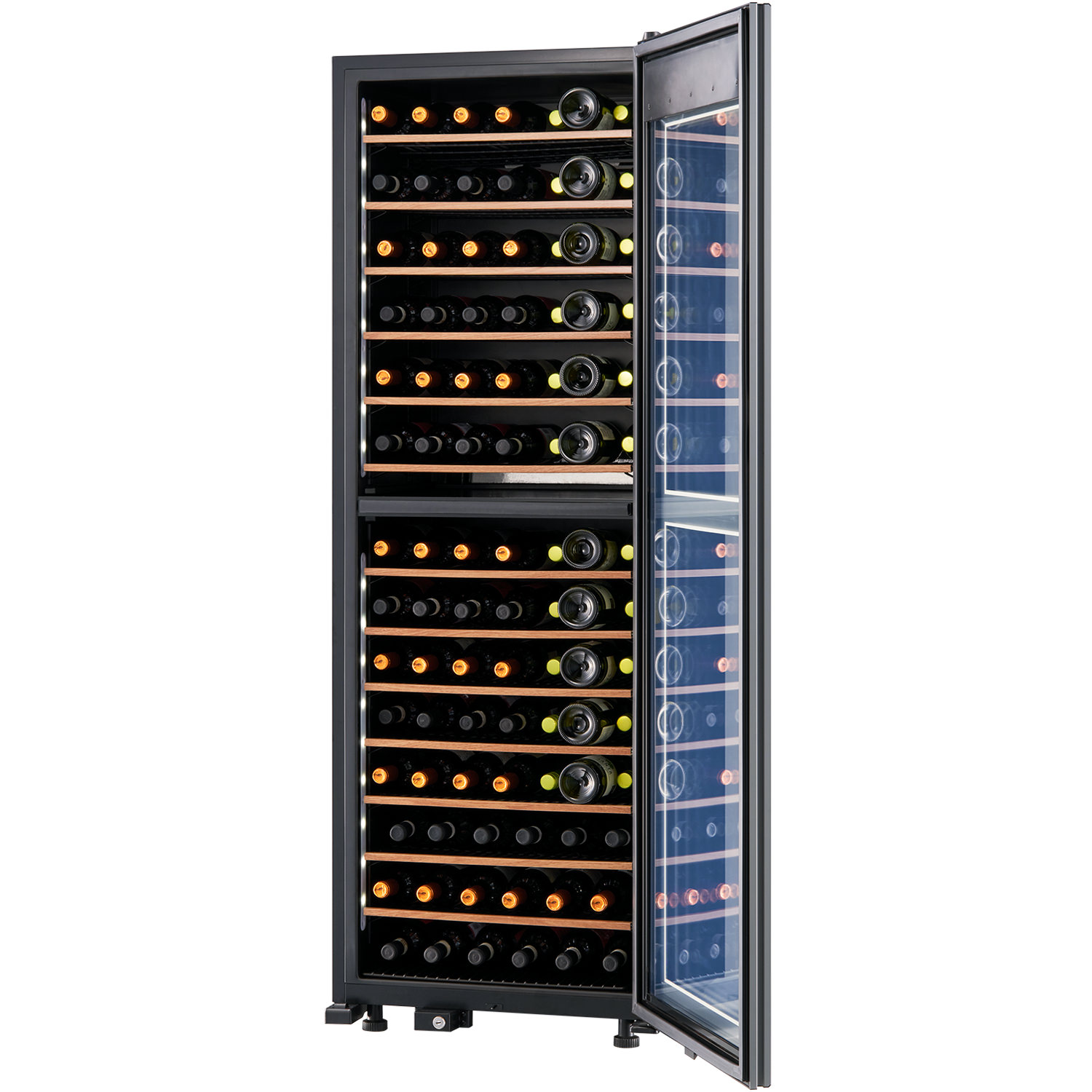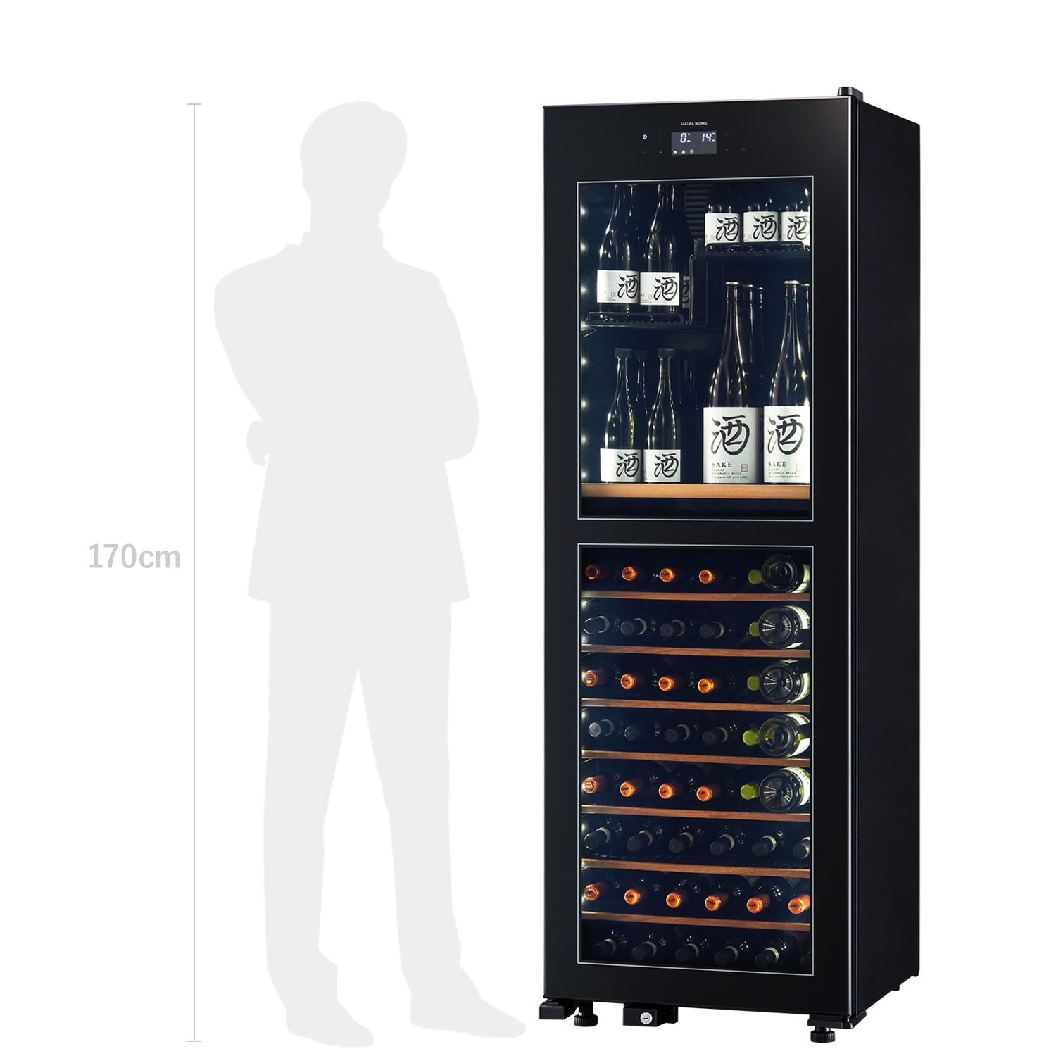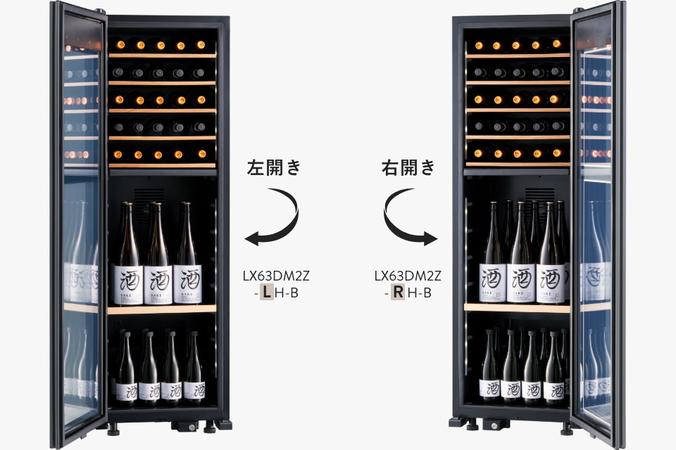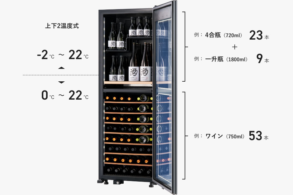 ワインのフルボトルを上室に42本、下室に53本、最大95本収納可能です。開栓して一度で飲み切らなかった日本酒も、立てて収納できる十分なスペースを確保しています。収納力を持たせつつ、横幅約60㎝、高さ約173㎝、奥行約60㎝と省スペース性に配慮した設計です。