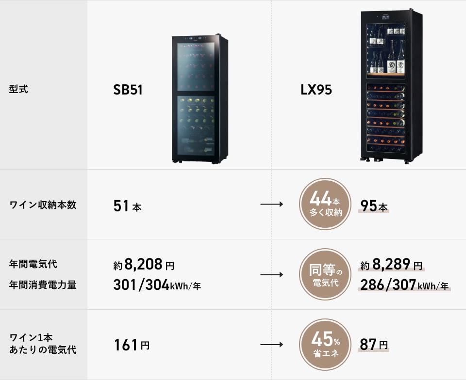 LX95は新しい冷却サイクルや真空断熱ガラスを搭載することで、これまでよりもさらに省エネ性能が高まっています。ワイン95本収納を収納できるLX95は、2017年に発売した51本収納タイプ SB51と年間電気代が同等です。ワイン1本を保管する際の電気代に換算すると約45%もの省エネ効果を得られています。