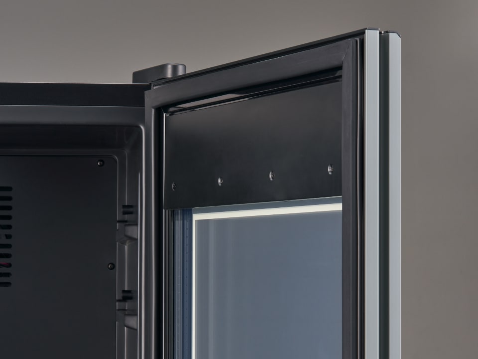氷温®M2シリーズの最も注目すべき改善点はガラスドアです。ガラスドアである以上、熱の流出入は避けられない課題です。そのため、季節によってはドア表面に結露が生じてしまうことがあります。氷温®M2シリーズは、ガラス内部を真空することでこれまでよりも大幅に断熱力がアップしています。ドアの結露防止ヒーターを搭載しなくても、結露を抑制する効果があり省エネ性にも大きく寄与しています。