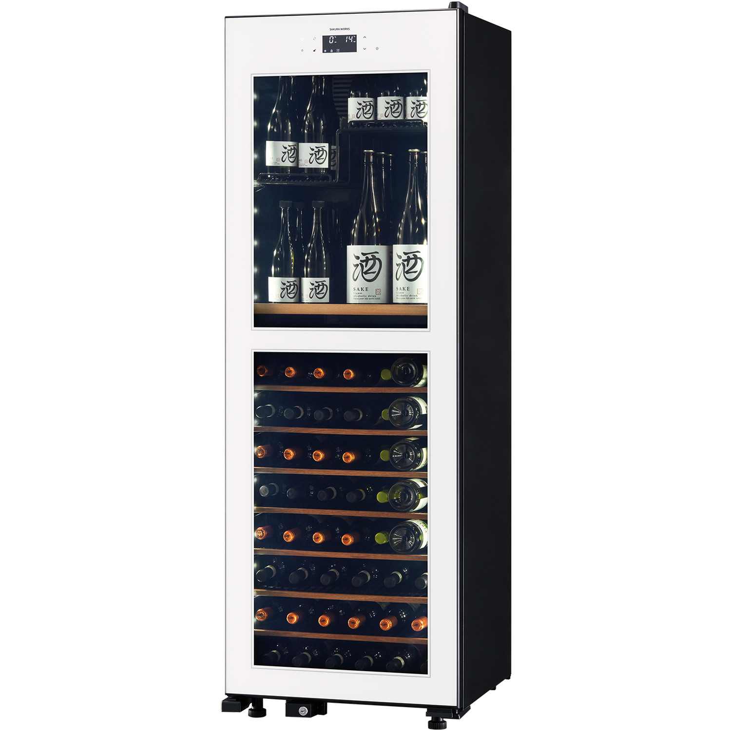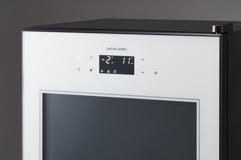 氷温®は、さくら製作所の中で初めて―2℃設定を実現した製品です。温度の下限が引き下げることに加え、コントロール性能も重視し、設定温度と液体温度のブレは0.1℃以下に抑えられています。設定可能温度は上室が―2℃から22℃、下室が0℃が22℃と、日本酒とワインの使い分けに配慮した設計です。