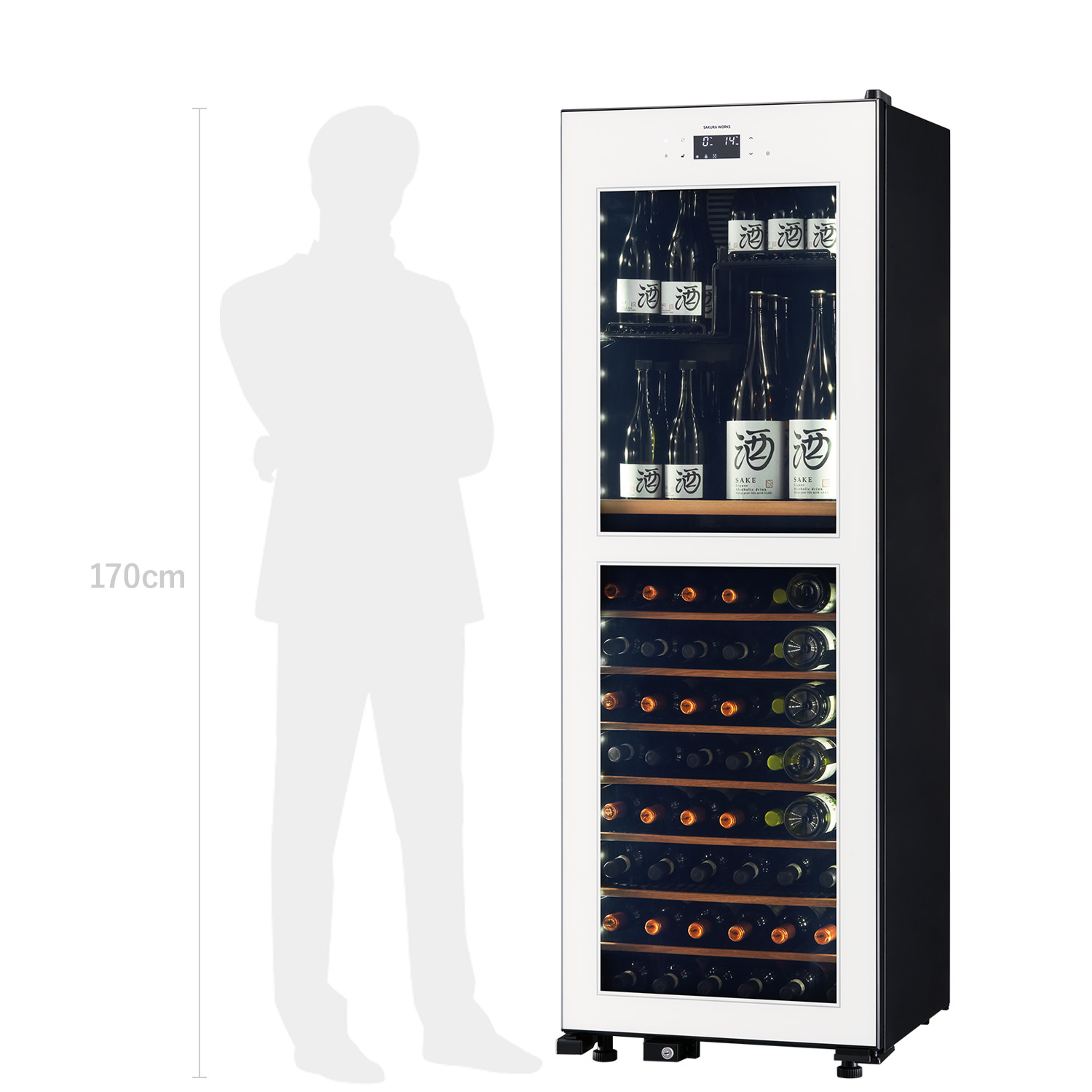 ワインのフルボトルを上室に42本、下室に53本、最大95本収納可能です。開栓して一度で飲み切らなかった日本酒も、立てて収納できる十分なスペースを確保しています。収納力を持たせつつ、横幅約60㎝、高さ約173㎝、奥行約60㎝と省スペース性に配慮した設計です。