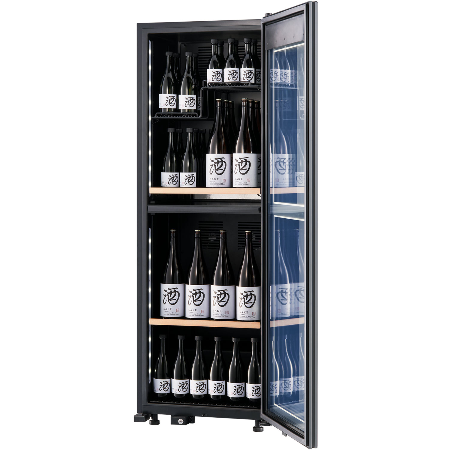日本酒は一度抜栓した後も、1週間から1か月程度味わいをキープできるので、一升瓶のように大容量のものは一度で飲み切らずに、何日もかけて楽しむ方が多いでしょう。しかし、一般的に日本酒の栓はワインのコルクよりも隙間が生まれやすく、ボトルを寝かせて保管すると液漏れが起きる可能性があります。そこで氷温®M2シリーズでは、栓をあけた後もセラーに戻して保管できるように、ボトルを縦置きできるスペースを広く確保しました。ずらりと並ぶコレクションを、目で見てもお楽しみいただけます。