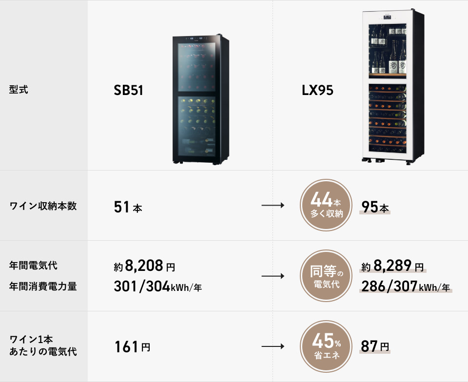 LX95は新しい冷却サイクルや真空断熱ガラスを搭載することで、これまでよりもさらに省エネ性能が高まっています。ワイン95本収納を収納できるLX95は、2017年に発売した51本収納タイプ SB51と年間電気代が同等です。ワイン1本を保管する際の電気代に換算すると約45%もの省エネ効果を得られています。
