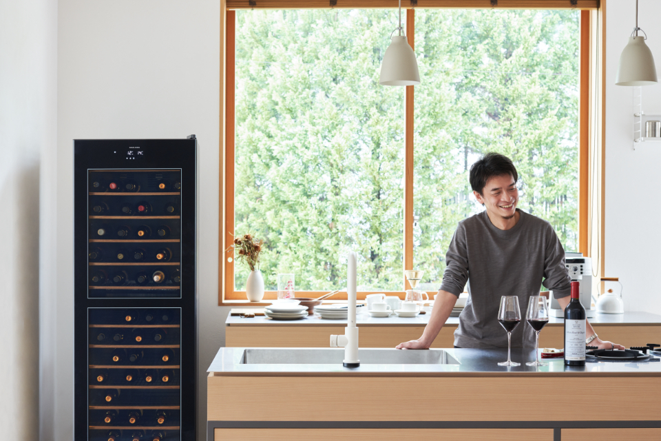 氷温®シリーズを2台設置し、観音開きのように使用することで、赤のフルボディ、ミディアムボディ、白ワイン、スパークリングワインの4種類を個別の温度で管理できるようになります。ワイン、日本酒、クラフトビール、ソフトドリンクといったさまざまな酒類も、用途に応じてキンと冷やしたり、適度な冷え感でサーブしたり、季節によって味わいの幅をコントロールしても面白いでしょう。ご家庭ではなかなかできない、最も美味しいお酒の飲み方を、手軽に実現できるセラーです。