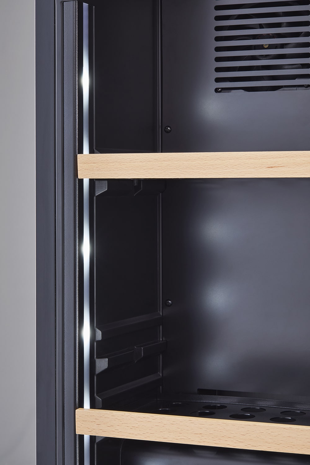 ワインセラーと似たスタイリッシュな見た目で、マットな質感のあるフレームが特徴的です。セラー内を照らすライトアップ機能は、縦置き保存したボトルのラベルデザインを一層引き立てます。また、優れているのはデザインだけではありません、耐久性と熱伝導率にも優れており、業務用の技術基準を有しています。ガラス端面を守る独自のフレーム設計です。