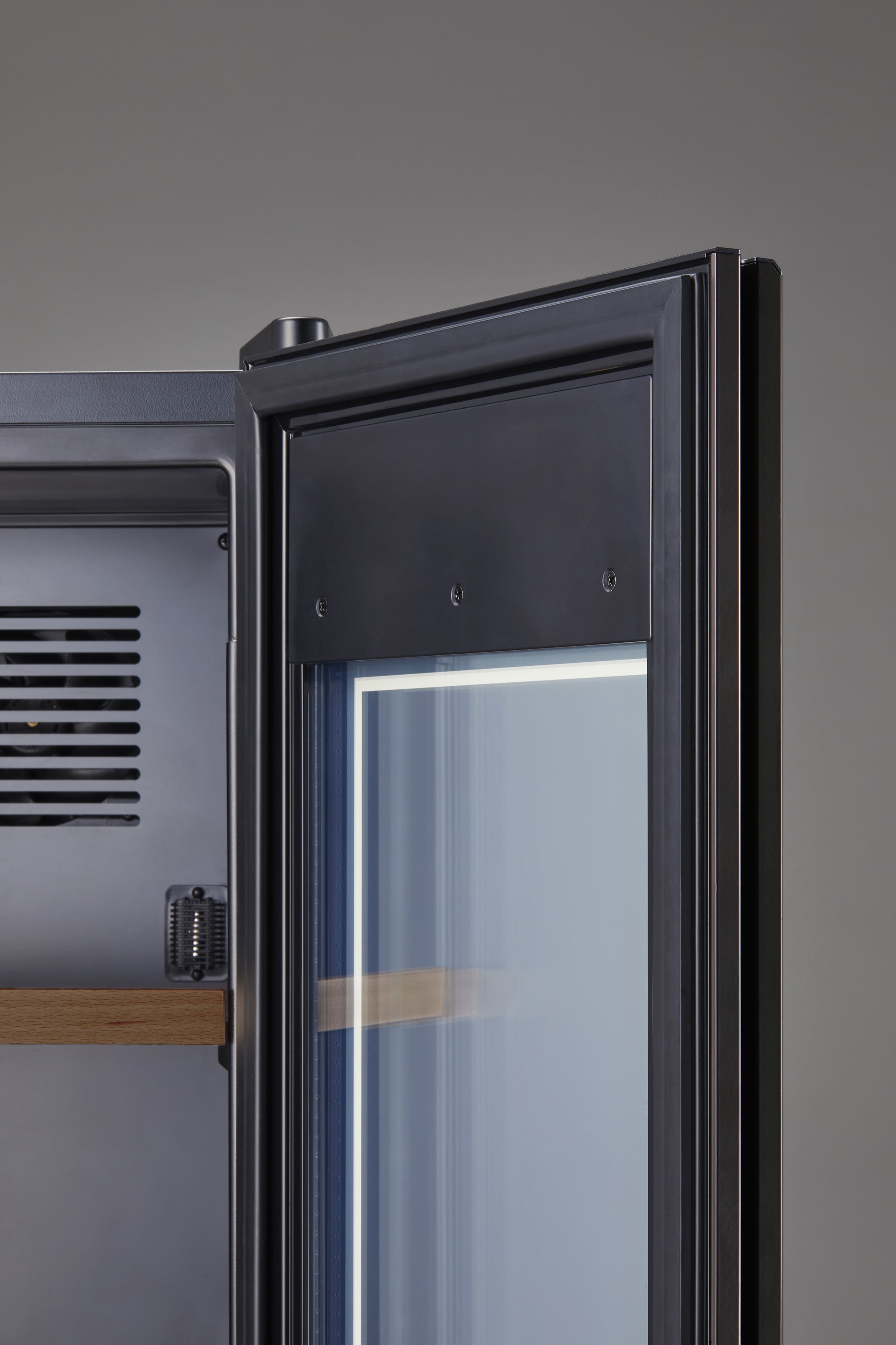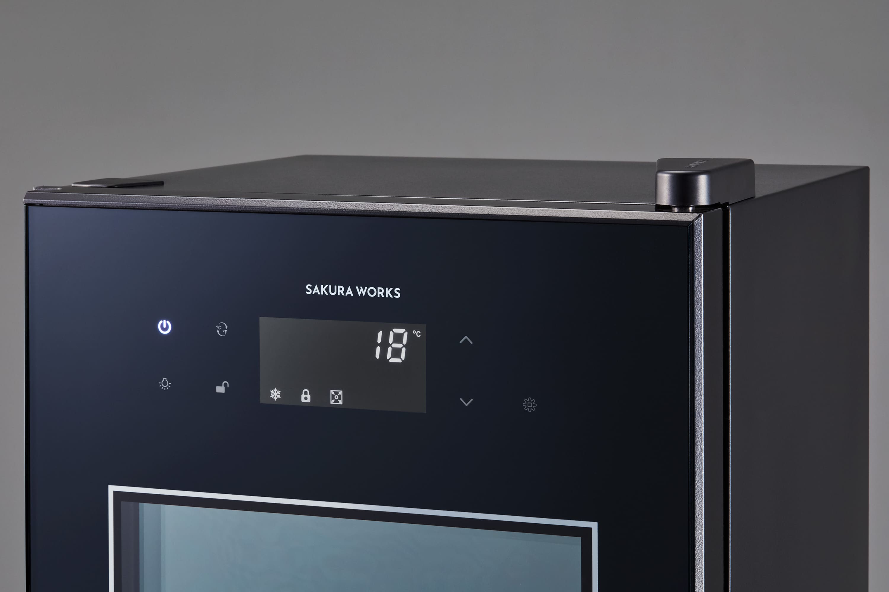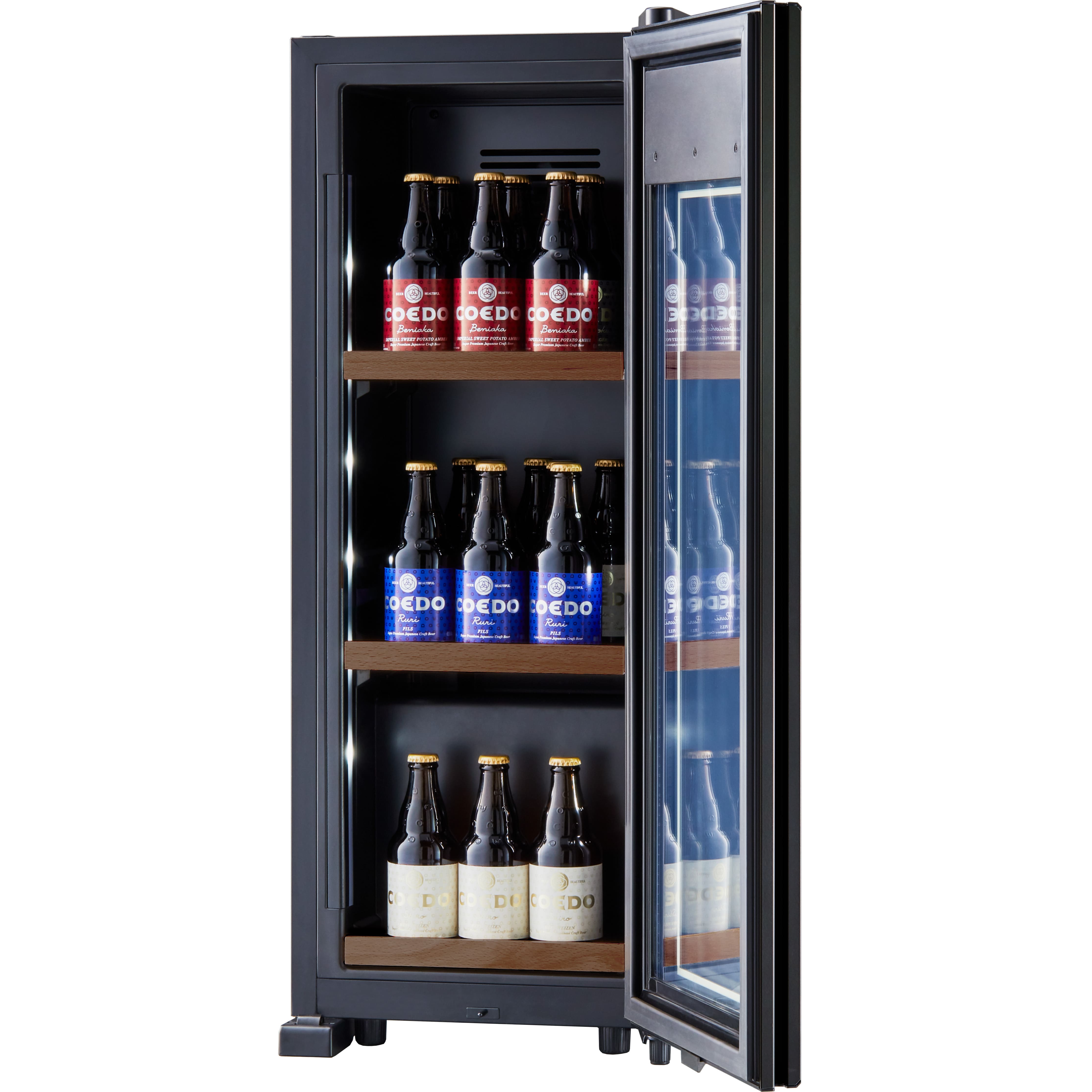 ワインセラーと似たスタイリッシュな見た目で、マットな質感のあるフレームが特徴的です。セラー内を照らすライトアップ機能は、縦置き保存したボトルのラベルデザインを一層引き立てます。また、優れているのはデザインだけではありません、耐久性と熱伝導率にも優れており、業務用の技術基準を有しています。ガラス端面を守る独自のフレーム設計です。