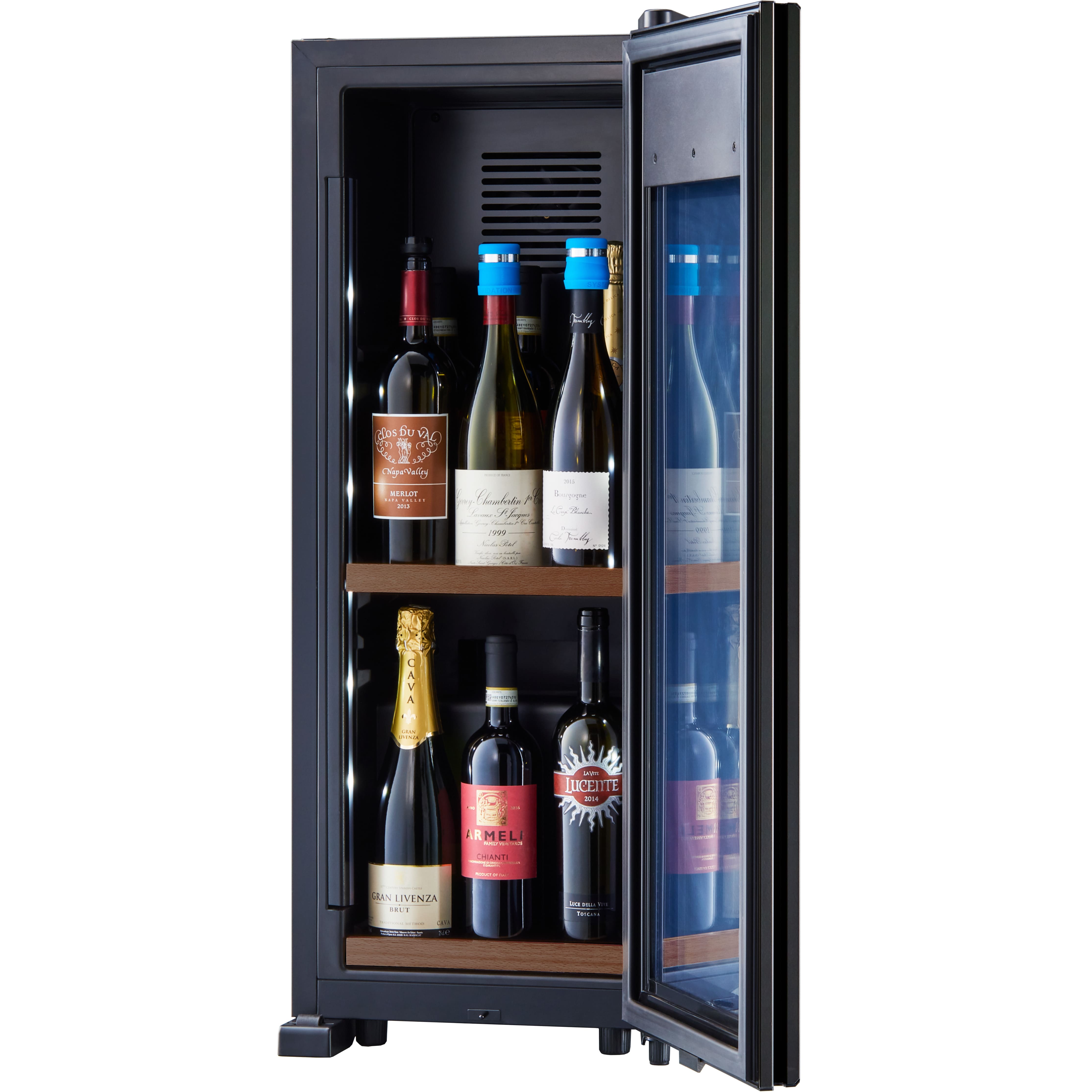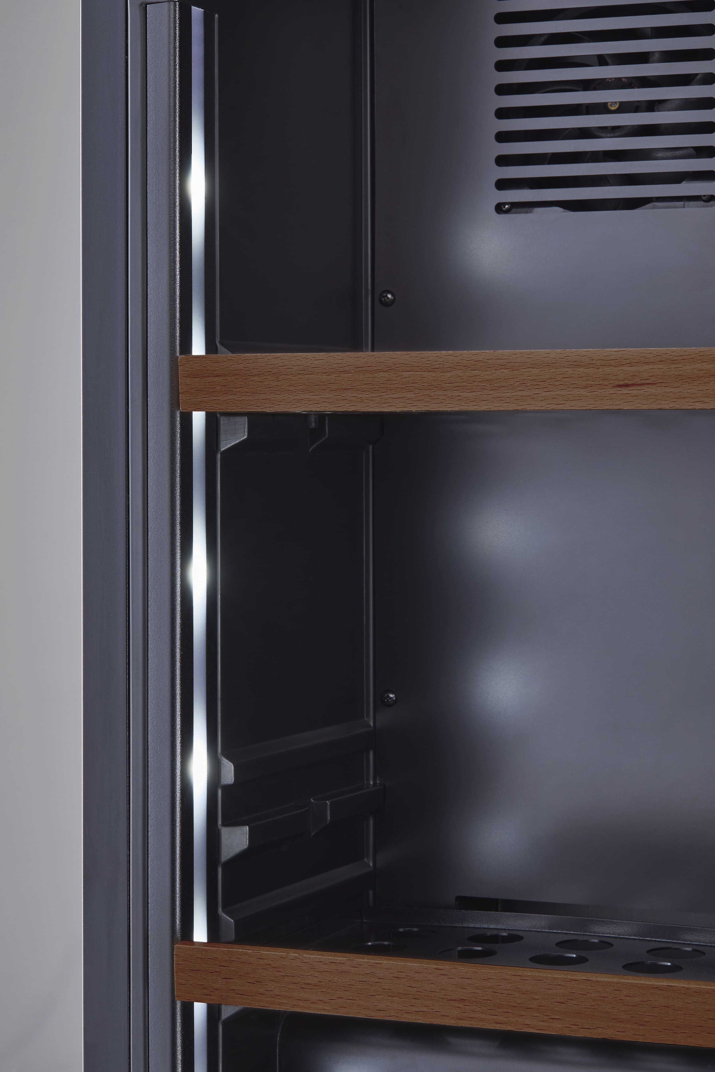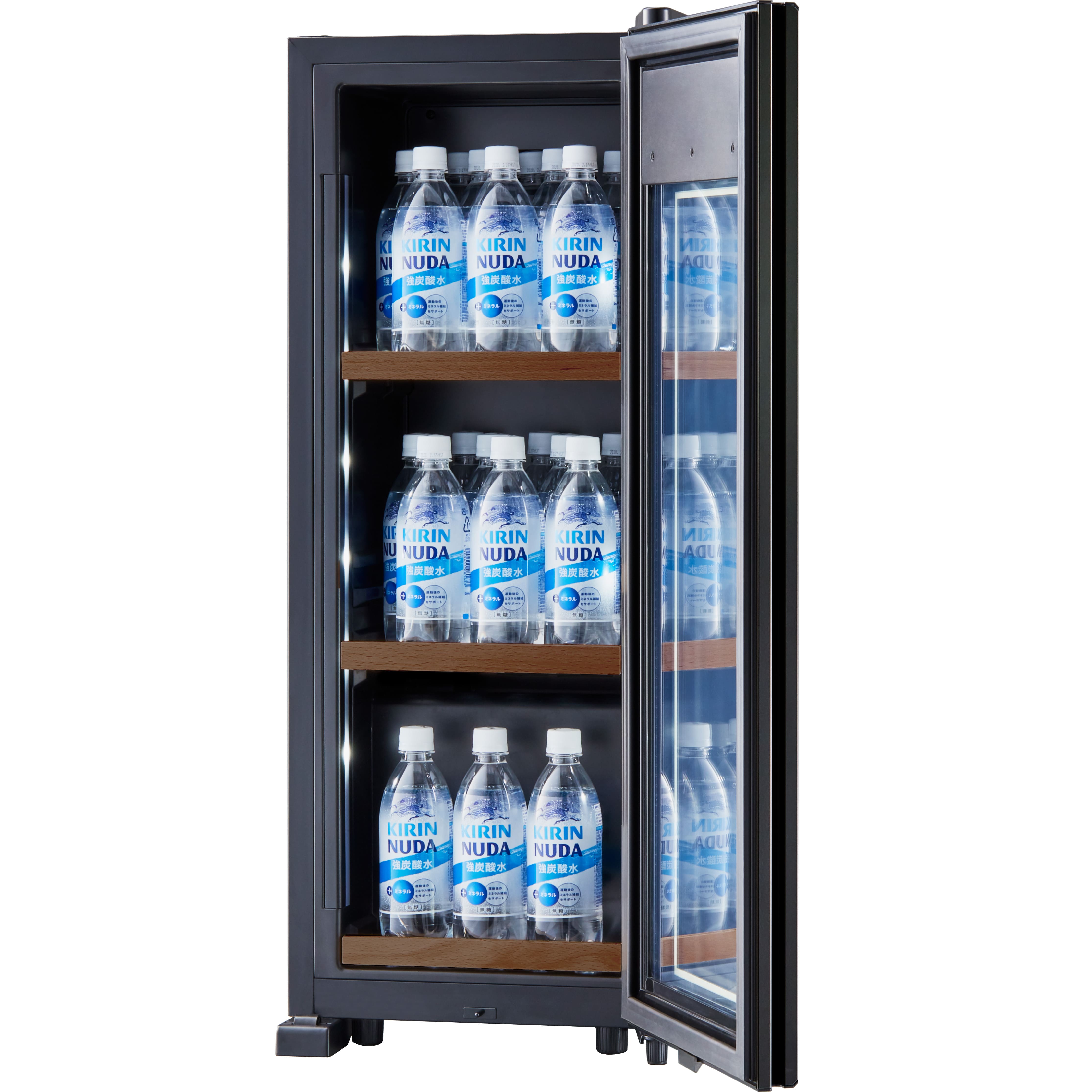 ワインセラーと似たスタイリッシュな見た目で、マットな質感のあるフレームが特徴的です。セラー内を照らすライトアップ機能は、縦置き保存したボトルのラベルデザインを一層引き立てます。また、優れているのはデザインだけではありません、耐久性と熱伝導率にも優れており、業務用の技術基準を有しています。ガラス端面を守る独自のフレーム設計です。
