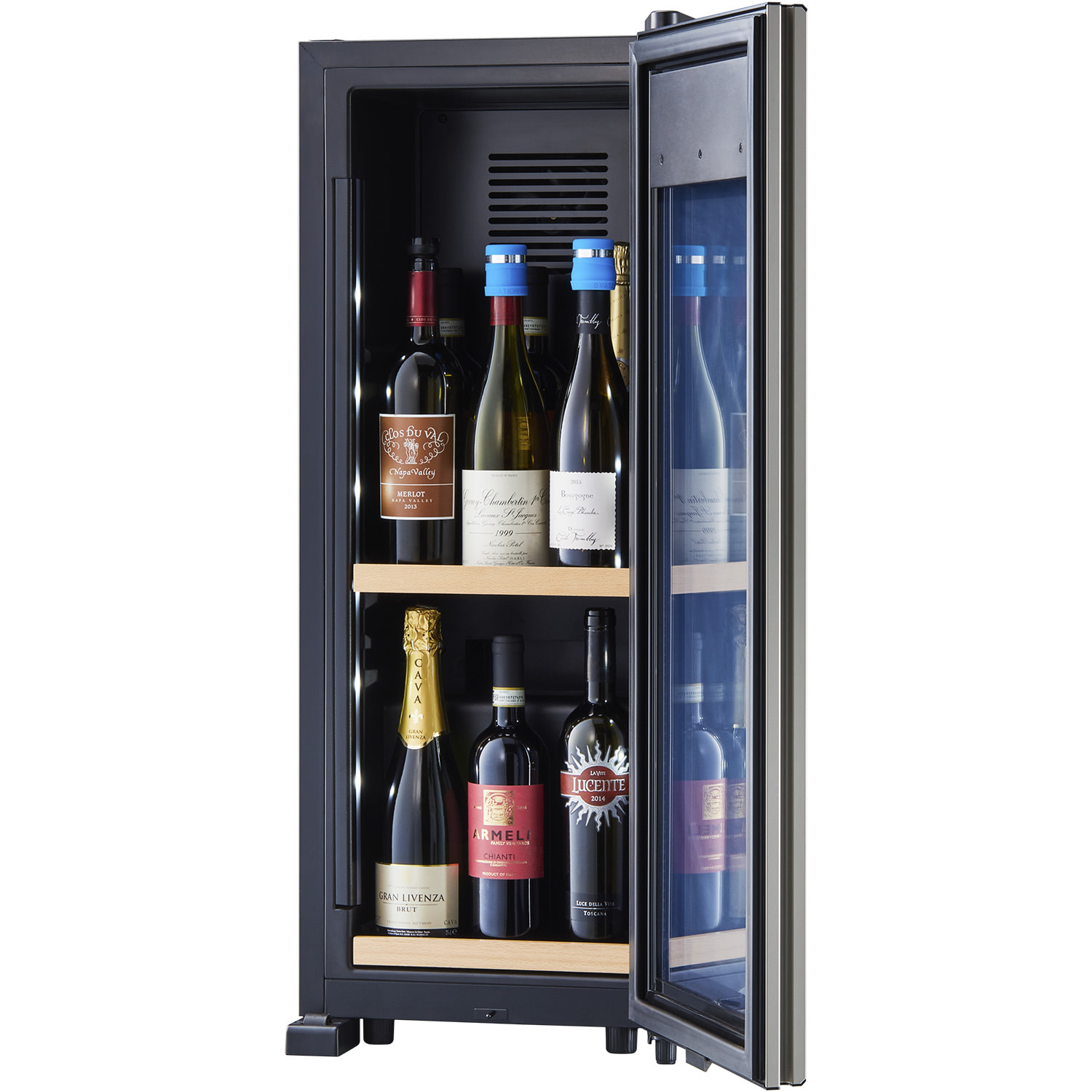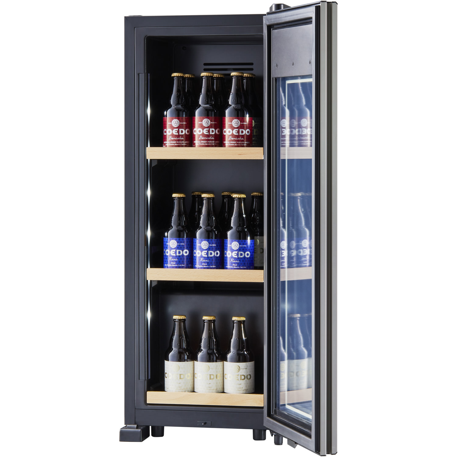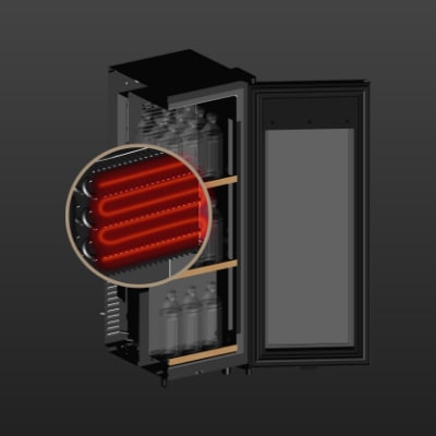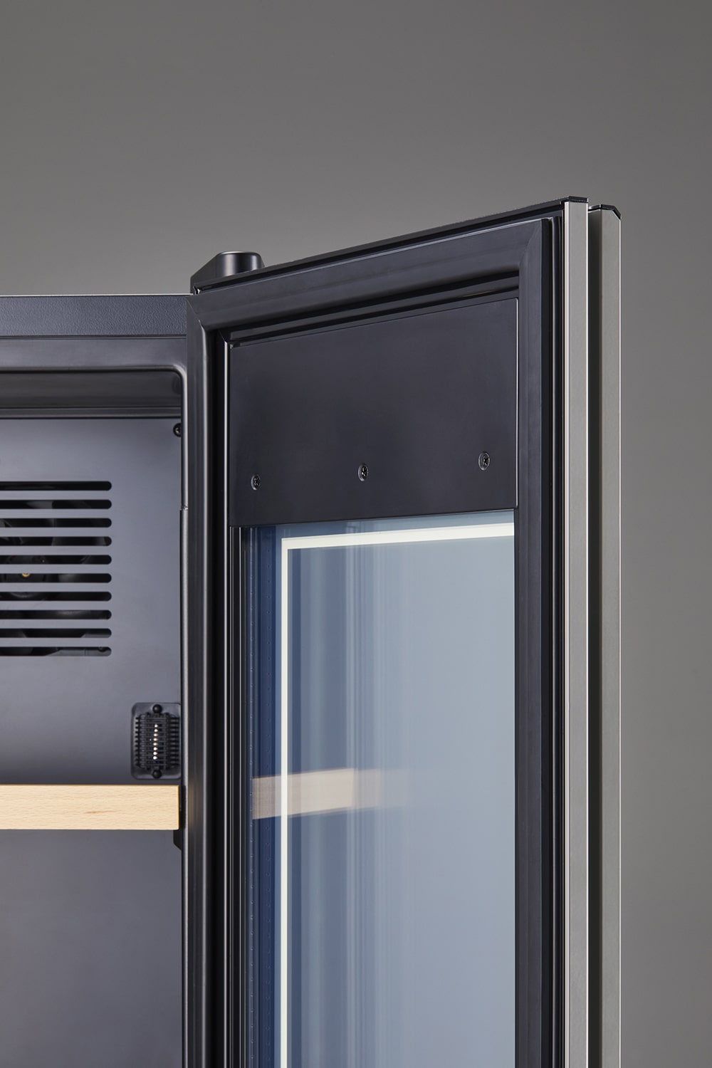 ワインセラーと似たスタイリッシュな見た目で、マットな質感のあるフレームが特徴的です。セラー内を照らすライトアップ機能は、縦置き保存したボトルのラベルデザインを一層引き立てます。また、優れているのはデザインだけではありません、耐久性と熱伝導率にも優れており、業務用の技術基準を有しています。ガラス端面を守る独自のフレーム設計です。
