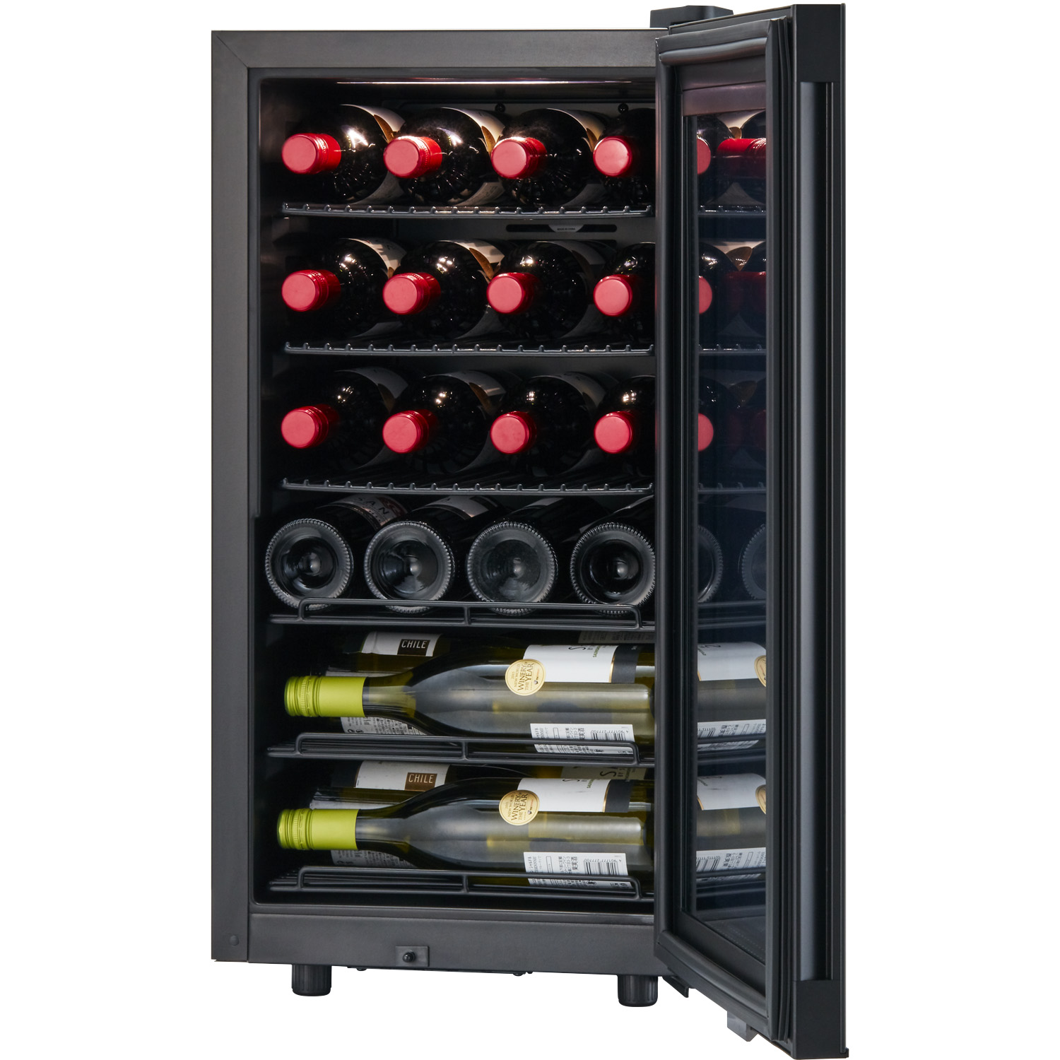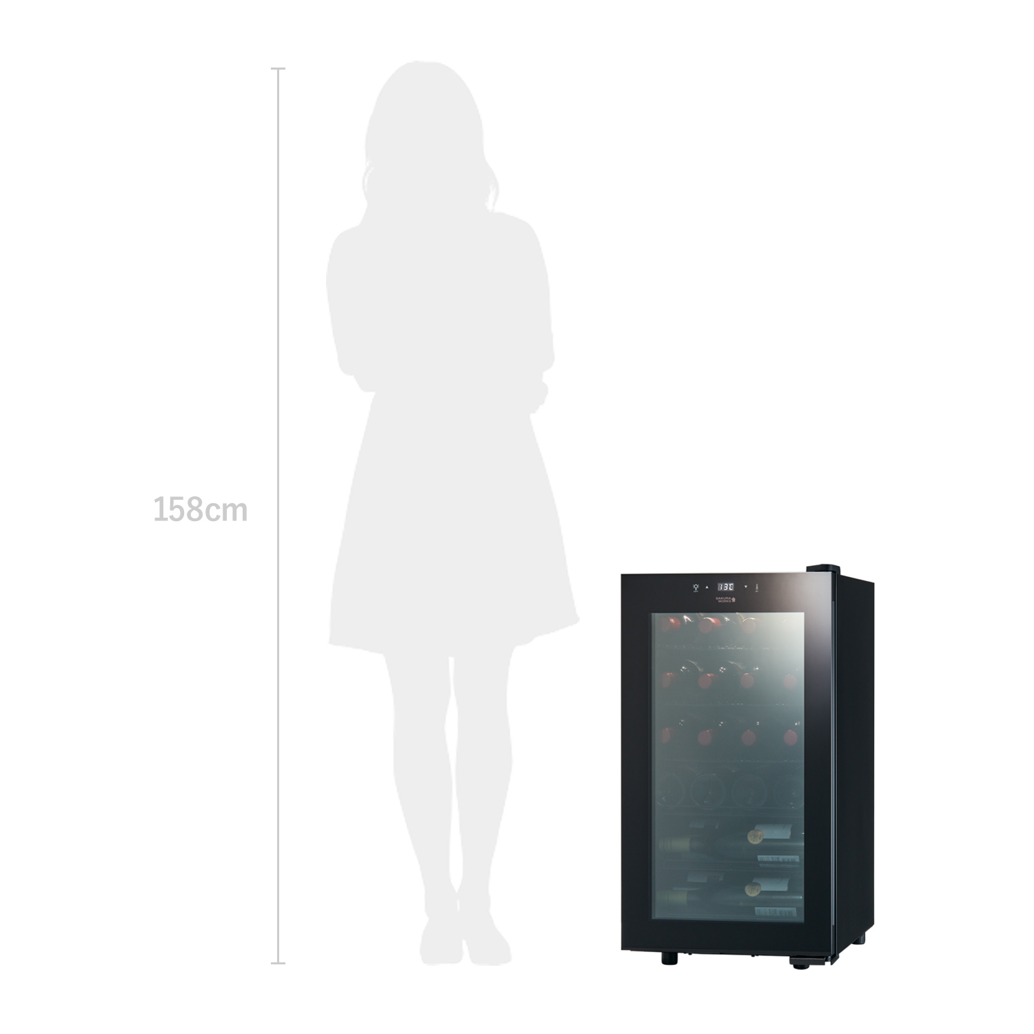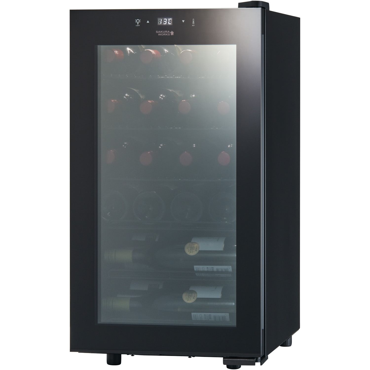 Smart SB22には、一般的なワインのフルボトルが22本収納できます。他の22本程度入るセラーとサイズ感を比べてみてください。もっとも小さい設置面積を実現しています。内箱をワインボトルがフィットするように工夫した成型技術で製作し、コンパクトで大容量化を実現。ボトル同志が近い距離で収納されるので、液体の比熱特性が生かされ、満タンにしたときほど省エネ効果を発揮しやすい特長を持っています。