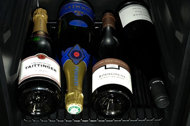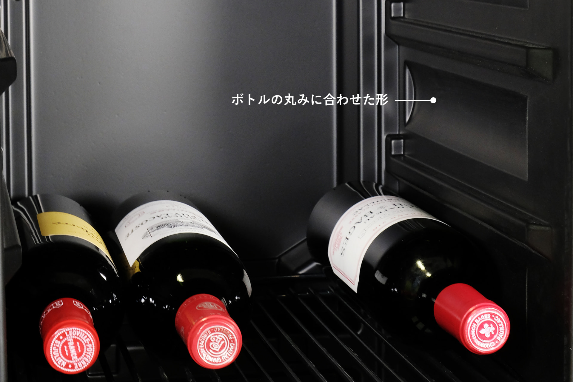ボトルの直径が96mm程度ある太めのスパークリングワインなどのボトルでも、スムーズに収納できる設計になっています。下段にも、高さが300mmまでの一般的なボルドーやブルゴーニュボトルが横置きで収納できます。