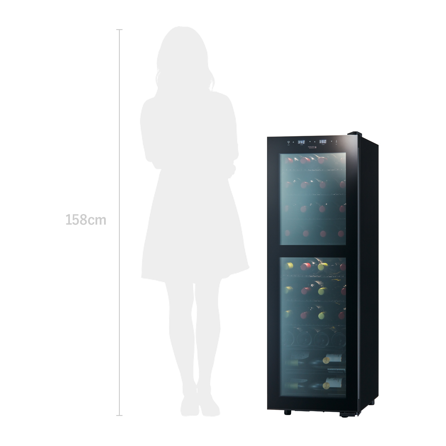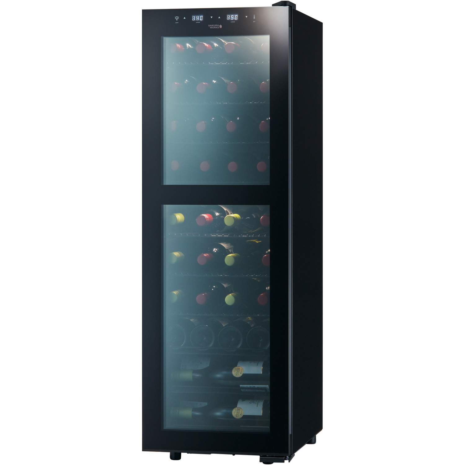 Smart SB38には、一般的なワインのフルボトルが38本収納できます。上室と下室、別々に温度管理が可能な使いやすいモデルです。最小クラスの設置面積に、独自の内箱で大容量化を実現。ボトルどうしが近い距離で収納されるので、液体の比熱特性が生かされ、満タンにしたときほど省エネ効果を発揮すしやすい特徴をもっています。