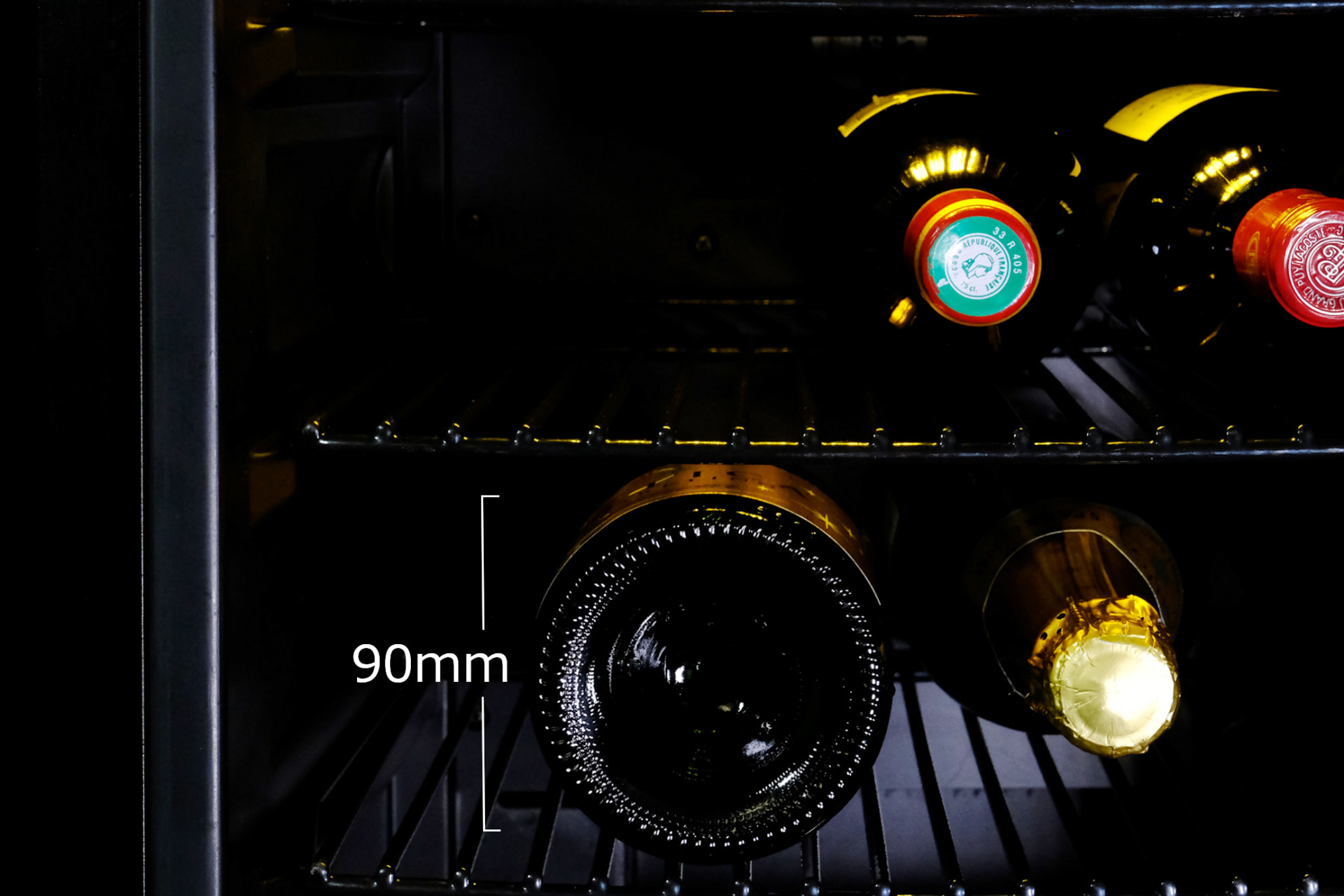 ボトルの直径が96mm程度ある太めのスパークリングワインなどのボトルでも、スムーズに収納できる設計になっています。下段にも、高さが300mmまでの一般的なボルドーやブルゴーニュボトルが横置きで収納できます。